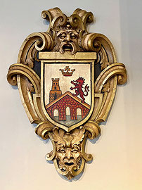 Blason armorial en bois peint de style renaissance espagnole Provenance: fut parti du décor intérieur du Cinéma Snowdon à Montréal Canada: circa 1940