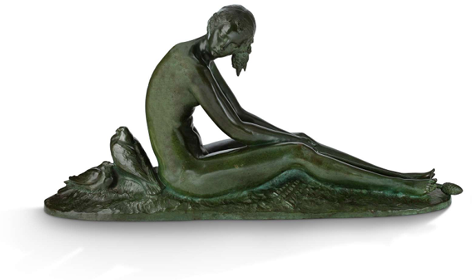 Bronze à. Patine Verte "Femme Nue" assise aux côtés de deux pigeons. par Joseph Emmanuel Cormier. Signatures incisées ‘J. Cormier’ et ‘Susse Fes Edts Paris’, mention ‘cire perdue'. France: circa 1930