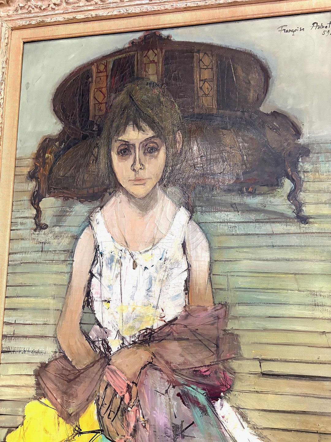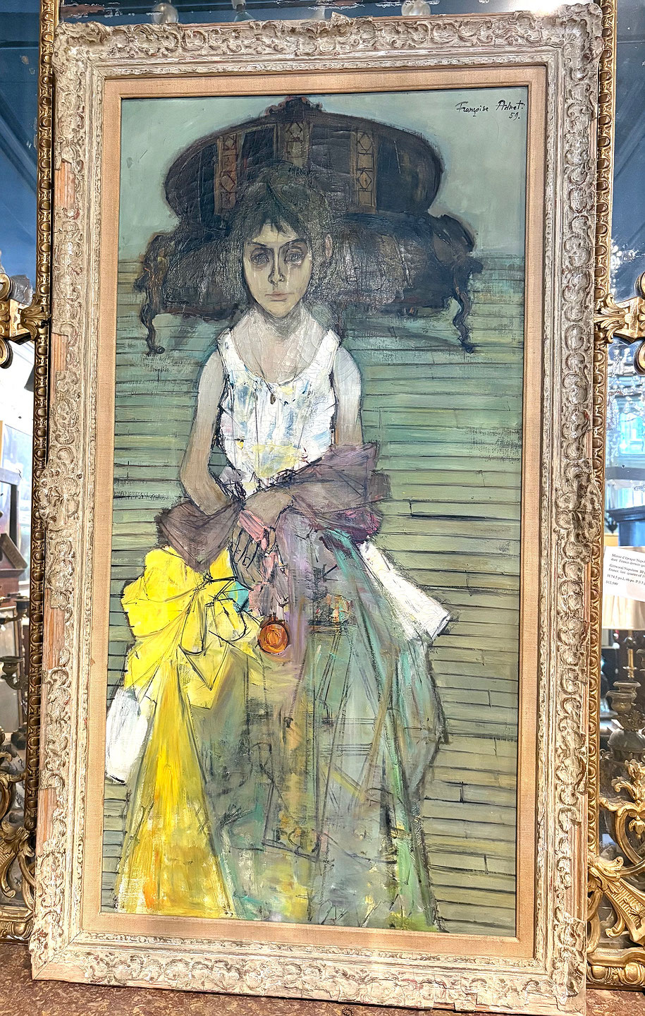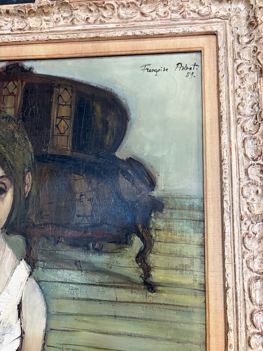 ADNET, Françoise (1924-2014) - "Fille à la robe jaune dent un canapé". Huile sur toile . Née à Montmartre dans un milieu d'artistes en 1924, Françoise Adnet était fille du décorateur et ensemblier Jacques Adnet. Elle entrprend une carrière de pianiste qui la mène sur de nombreuses scènes en Europe mais ses passions véritables sont le dessin et la peinture , elle decide donc de s'y consacrer entièrement. Elle est fortement influencée, comme Bernard Buffet et Jean Jansem, par son ami Francis Gruber. Elle est de ces peintres de la réaction figurative, opposés à l’abstraction, et qui font partie du mouvement « misérabiliste » qui réunit entre autres Bernard Buffet, Jansem, ou encore Michel de Gallard. Signée en haut à droite: Françoise Adnet. Provenance: Collection de M. J.L.G. Granby Quebec Canada.