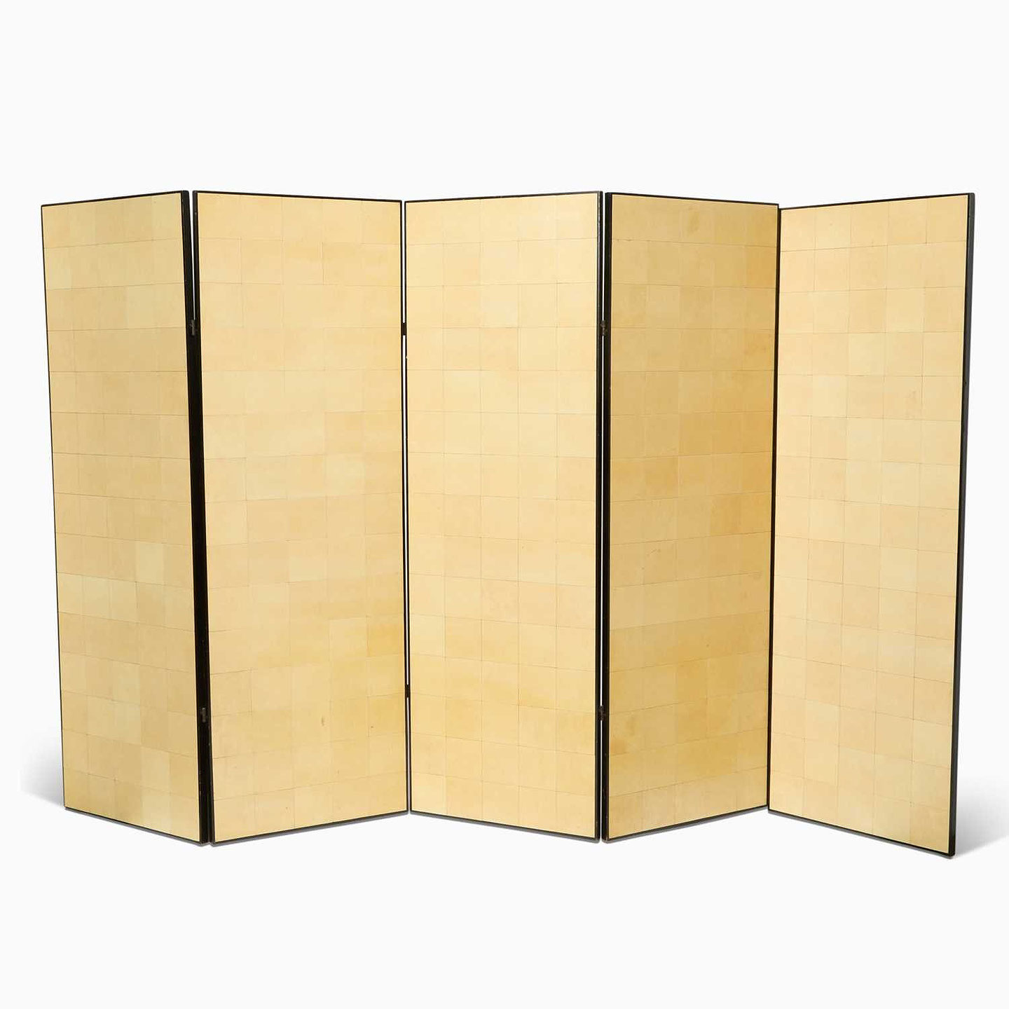 Parchment and Ebonized Five-Panel Folding Screen France: circa 1940 Provenance: With Eclectiques Gallery, Soho New York Jerome Robbins Maurice Chevalier