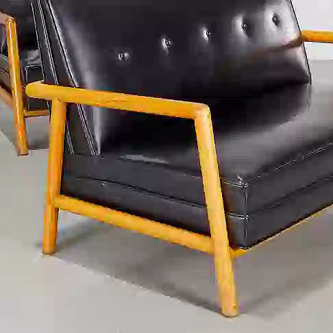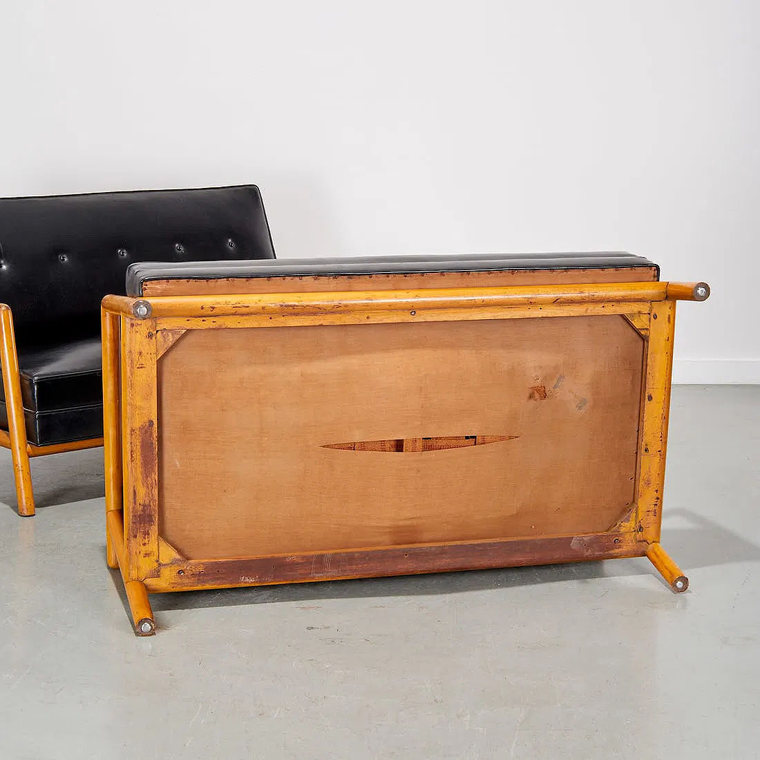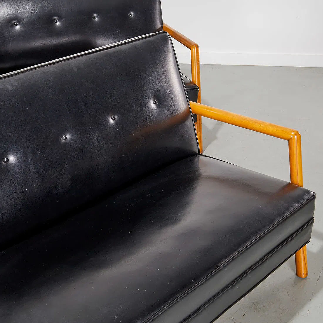 Pair of patent leather and bleached walnut settees by T.H. Robsjohn-Gibbings model no.1679. USA: circa 1950
