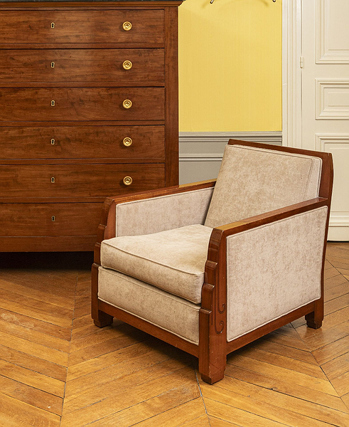 Paire de fauteuils modèle « Niagara » en noyer par Maurice Dufrène aux montants avant à gradins formant motif de cascade, rainurés latéralement de hampes et volutes Cette paire de fauteuils “Niagara”, dessinée par Maurice Dufrène (1876–1955) vers 1929, est l’un des modèles emblématiques du mobilier français de l’entre-deux-guerres. Les montants avant à gradins, évoquant une cascade stylisée, ainsi que les rainures latérales ornées de hampes et volutes, traduisent la recherche d’un équilibre subtil entre décor et structure, typique de l’Art Déco à son apogée. Bibliographie : Sièges Français, Éditions Charles Moreau, vers 1929, planche 8