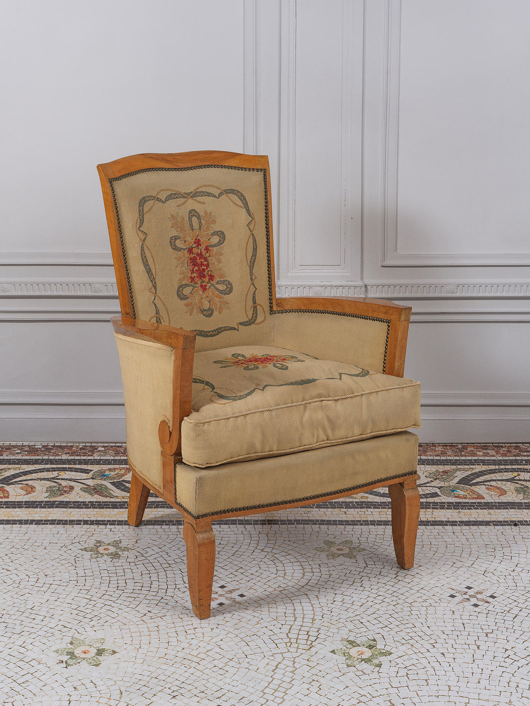 Suite de trois fauteuils en noyer et tapisserie d'Aubusson Estampillée 'J Leleu', '17991', '17992' et '17993' France: 1943 Provenance Collection Monsieur et Madame Arthur Lardillat, France Puis par succession jusqu'à l'actuel propriétaire Bibliographie J. Leleu, "Où en est l'Art Décoratif Français" in Mobilier et Décoration, n. 3, mars 1948, p. 74 pour nos exemplaires
