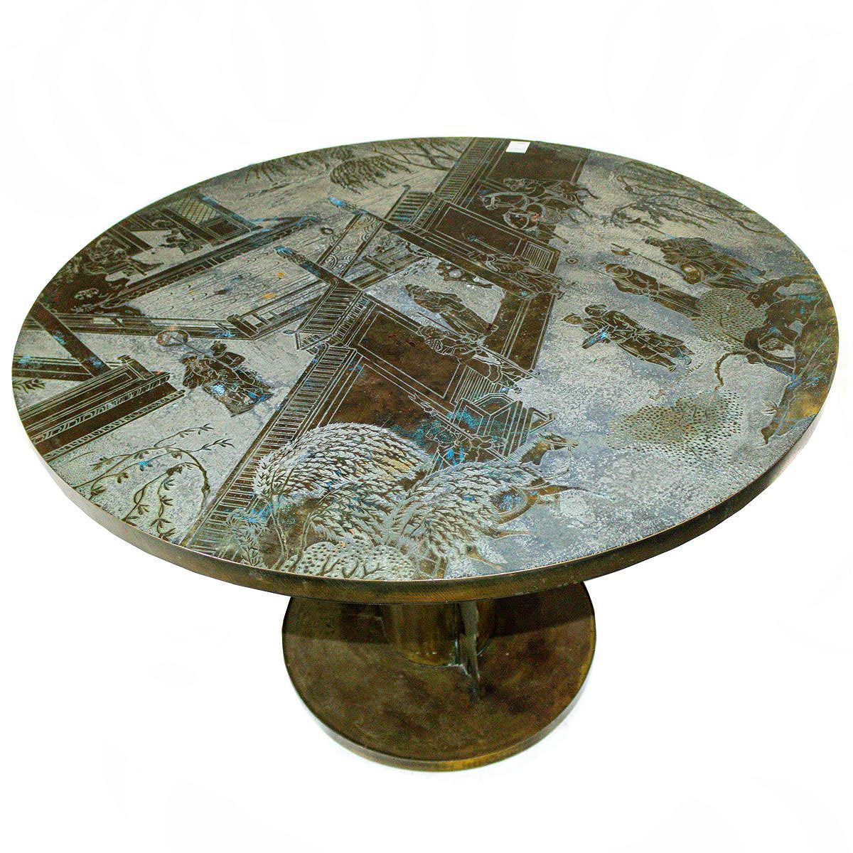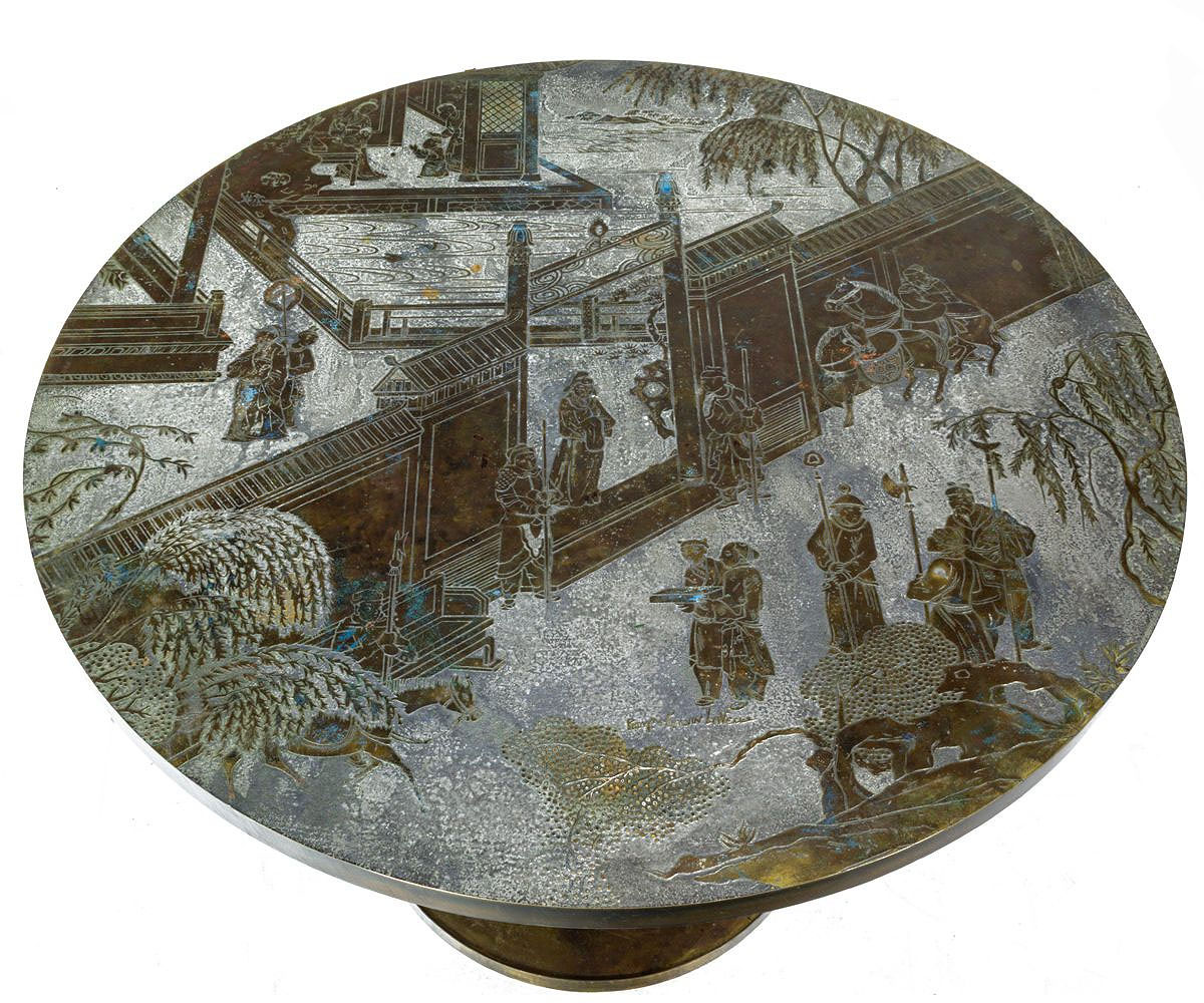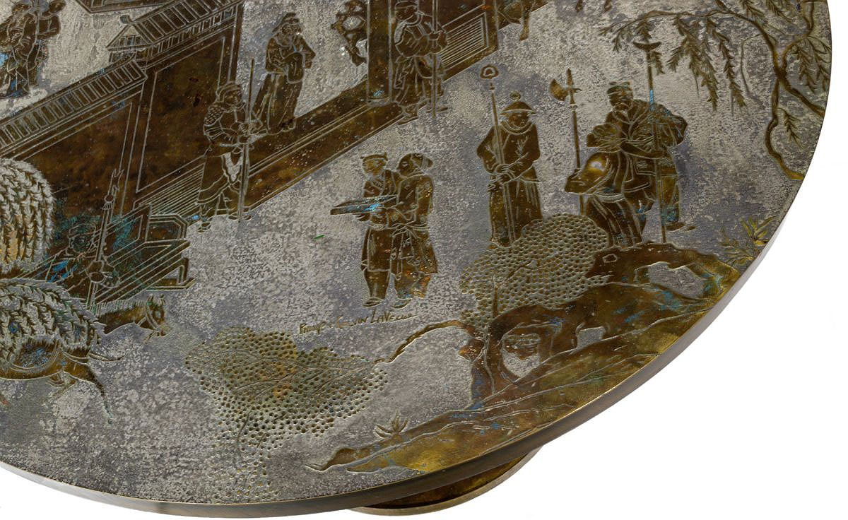 Engraved and acid-etched, patinated and polychromed bronze, pewter and enamel "Chan" circular coffee table by Philip and Kelvin LaVerne. Signed "Phillip and Kelvin Laverne." USA circa: 1965
