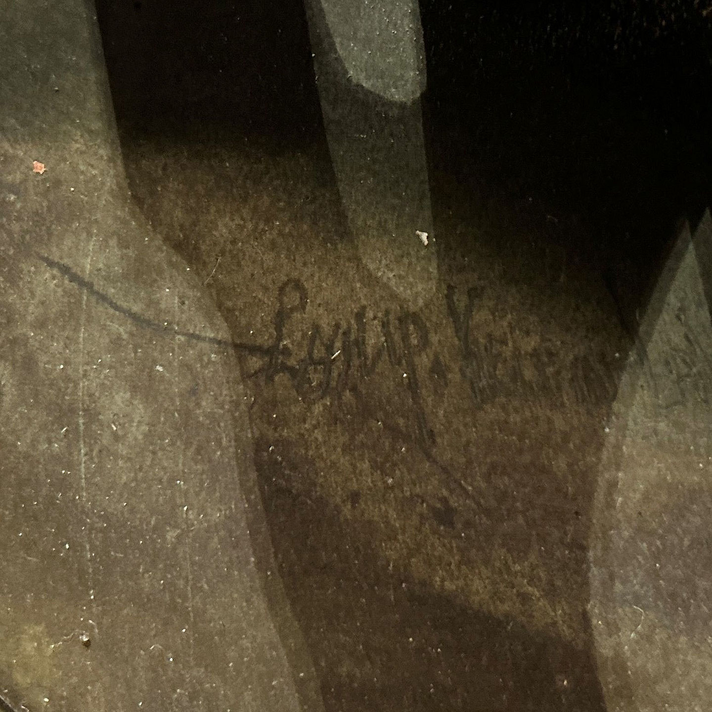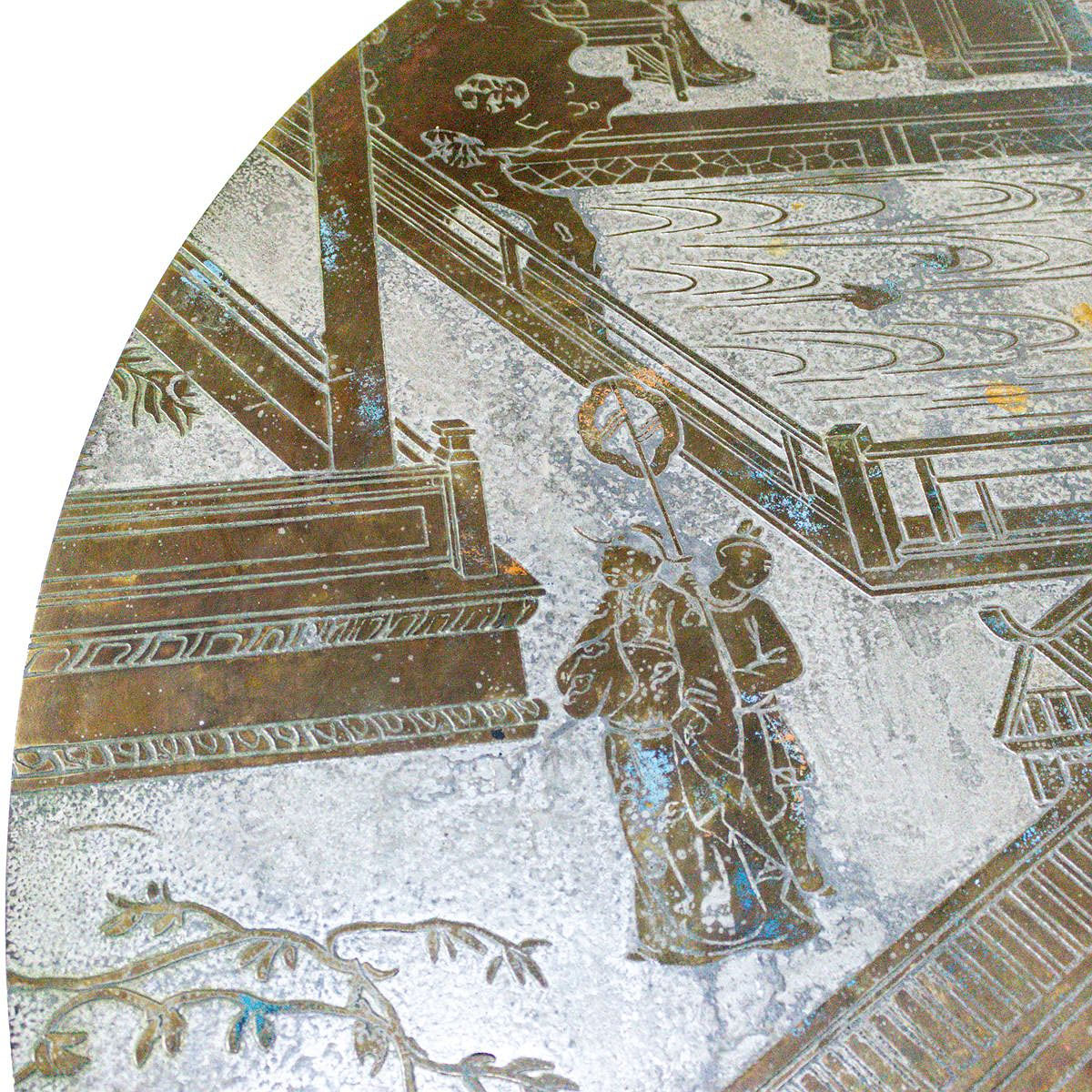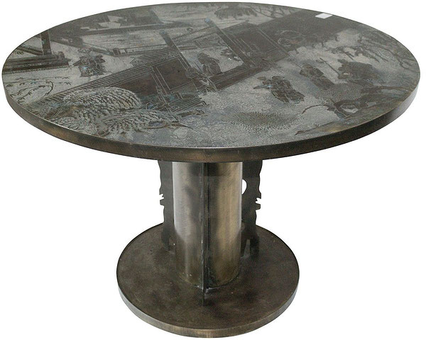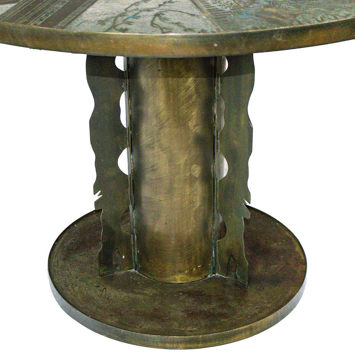 Engraved and acid-etched, patinated and polychromed bronze, pewter and enamel "Chan" circular coffee table by Philip and Kelvin LaVerne. Signed "Phillip and Kelvin Laverne." USA circa: 1965