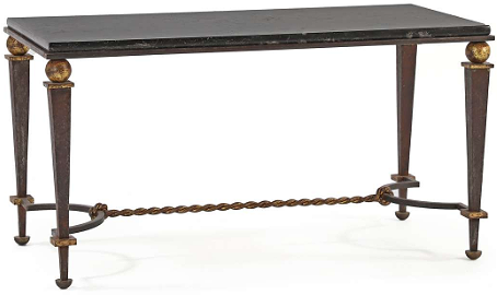 Table Basse Néo-Classique en Fer dans le Goût de Gilbert Poillerat avec insertion d'un plateau en marbre noir et décoré d'une entretoise torsadée. France: circa 1950