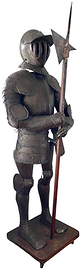 Armure de chevalier francais de style médievale, portant une hallebarde. Reproduction décorative en acier datant du début du 20eme siècle.