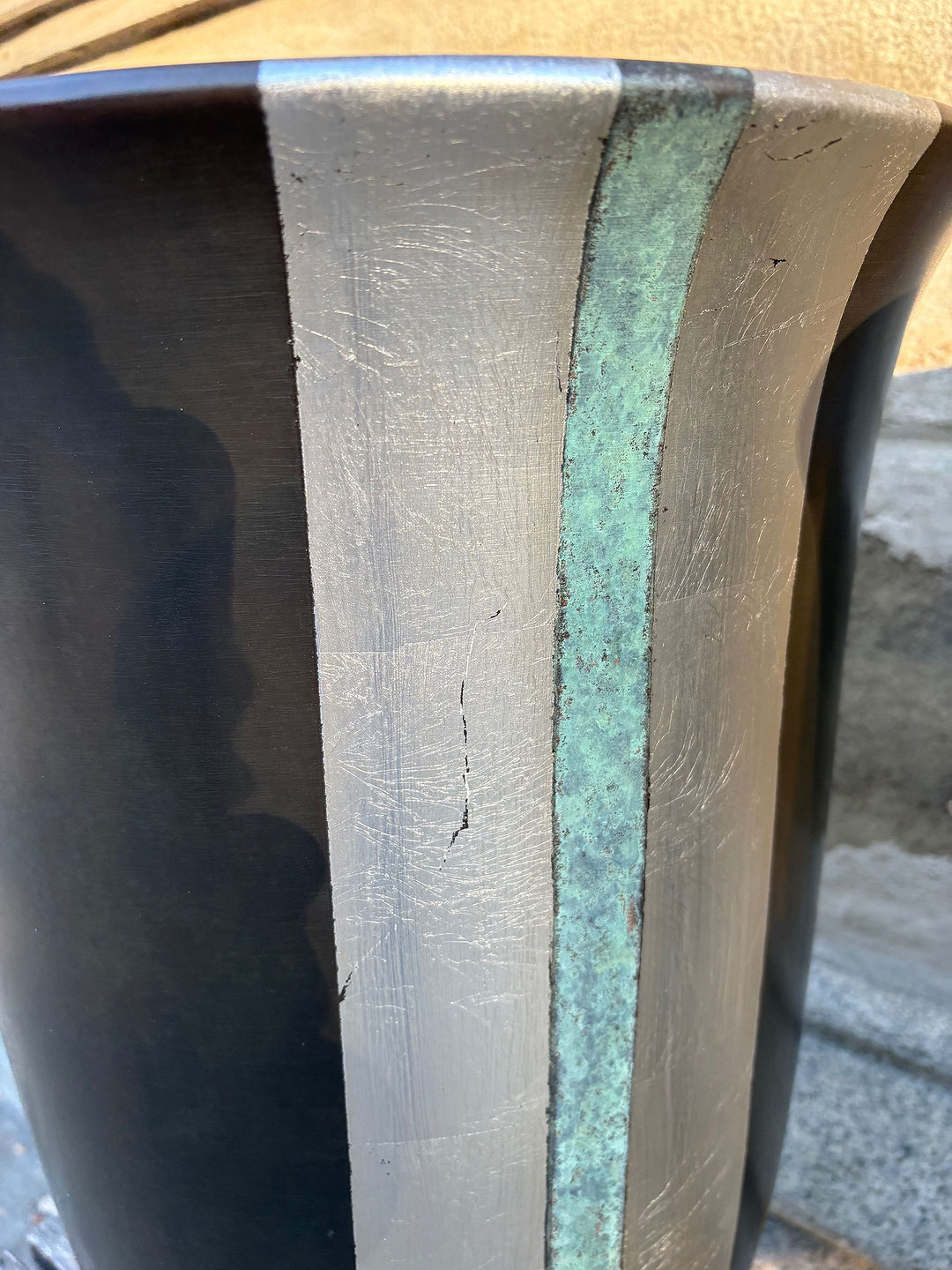 nouveauPair of Art Deco Style Urns in Bronze with Applied Silver leaf and patined vers de gris lines by Karl Springer