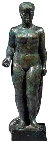 Green patinated bronze of a standing nude woman by Lucien Gibert Lucien Gibert (1904-1988) was a French sculptor. He began his artistic training in his father's cabinetmaking workshop. He first entered the School of Fine Arts in his hometown of Saint-Étienne, then studied under Jean Boucher at the École Nationale Supérieure des Beaux-Arts in Paris. Gibert, however, preferred to work independently under the guidance of Charles Despiau, who directed his efforts toward a less conventional style. Heavily influenced by Aristide Maillol, Gibert initially practiced direct carving in wood and stone. He received a gold medal in 1937 at the Paris International Exposition. Awarded a prize and scholarship by French Equatorial Africa in 1948, he traveled first to Algeria, then to sub-Saharan Africa, bringing back sketches and photographs that inspired numerous sculptures, which he exhibited at the Salon des Artistes Français. He was made a Knight of the Legion of Honour in 1950. Gibert completed numerous commissions for the French State, such as Young Girl from the South, exhibited at the Montpellier Museum, Algerian Dancer for the Museum of Overseas France, and Offering, Woman in Stockings, Maternity, etc., for the Museum of Modern Art of the City of Paris. He also designed more than two hundred medals for the Paris Mint, an institution of which he was the director. Signed "GIBERT"; Numbered "EA 3"; Lost-wax foundry mark: Serralherio France: circa 1940