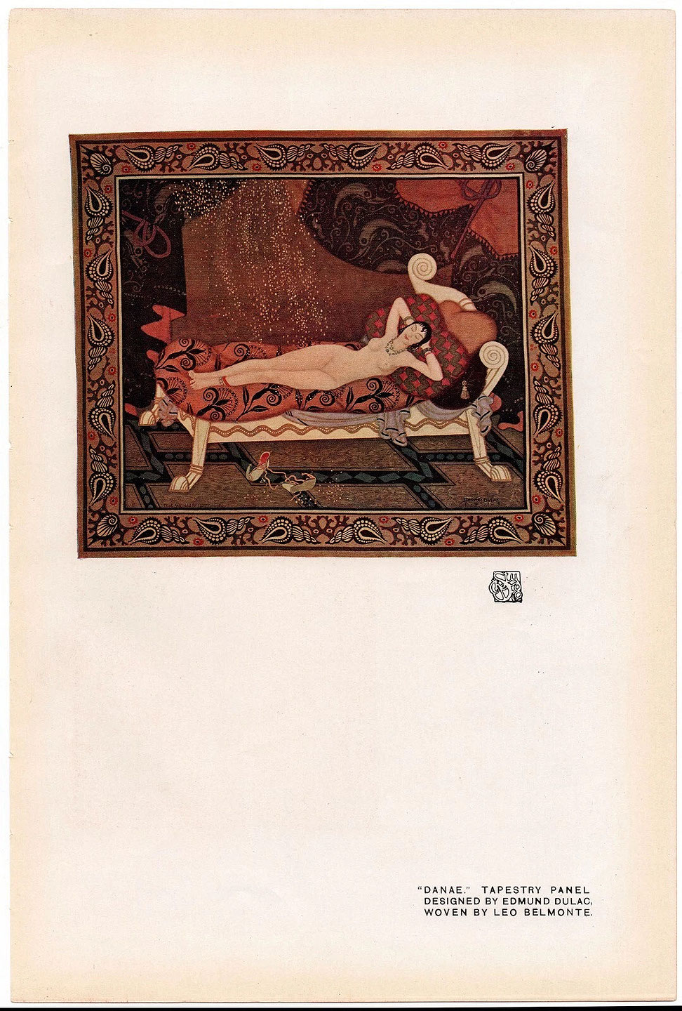 Wool Tapestry "Danae" by Edmund Dulac and woven by Léo Belmonte Signed to lower right corner in weave: Edmund Dulac, 1915 Inscribed to lower left corner in weave: TISSE PAR LEO BELMONTE PRO PAUL LEDERLIN. France: 1915 Provenance: Part of a private New York collection for the past 40 years LITERATURE: International Studio, vol. 62, New York, 1917, p. 159 (similar example illustrated).