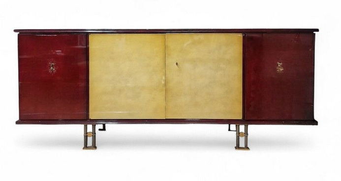 Maison LELEU GRAND BUFFET ENFILADE Circa 1960 en bois laqué et piètement en bronze. Il ouvre par 4 portes et décoré sur les extrémités de motifs naturalistes et géométriques Signé à l'intérieur dans un cartouche Complet de ses 3 clefs (deux tordues) 95 x 234 x 52 cm (petits accidents, manques et chocs à la laque, état d'usage) Bibliographie l Modèle similaire répertorié page 238 dans Leleu par F. Siriex, Edition M.Hayot 2007. Modèle proche reproduit page 147 de l'ouvrage Leleu 50 ans de mobilier de décoration Editions Somogy. Provenance l Succession d'un appartement dans la Californie à Cannes