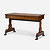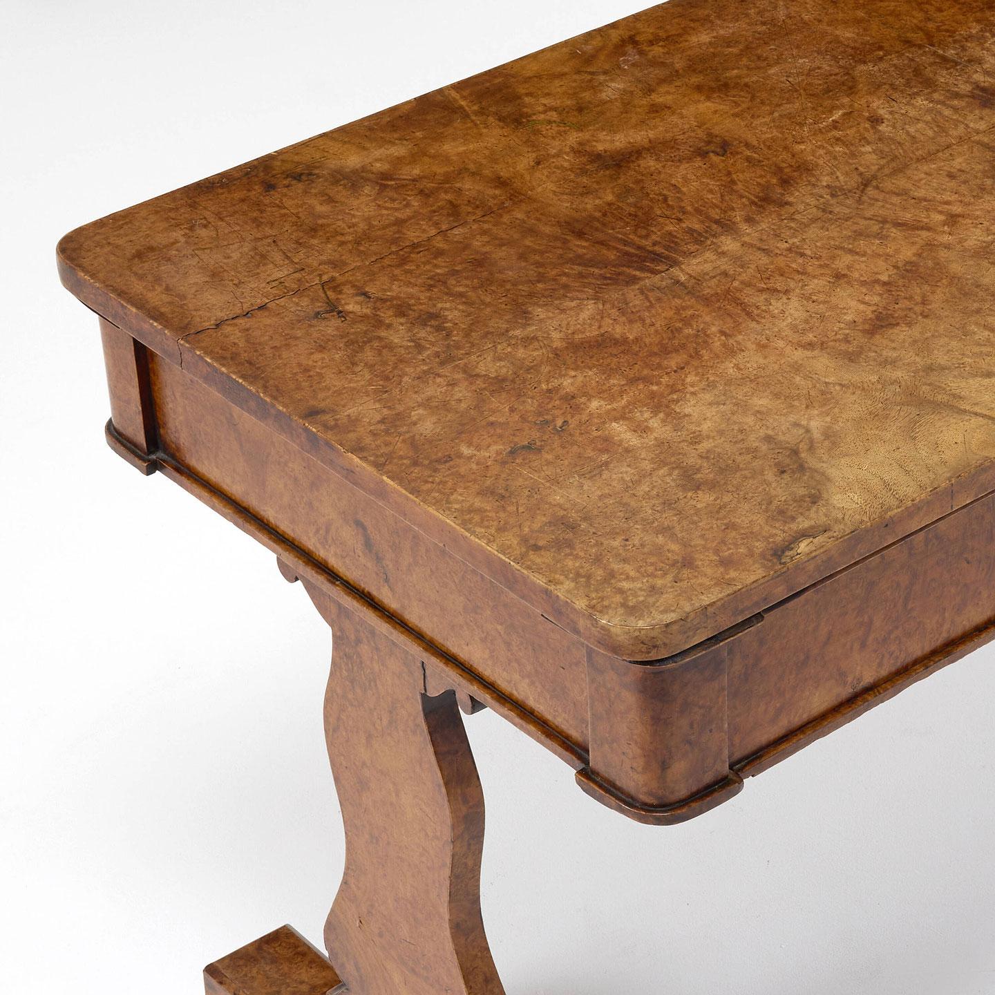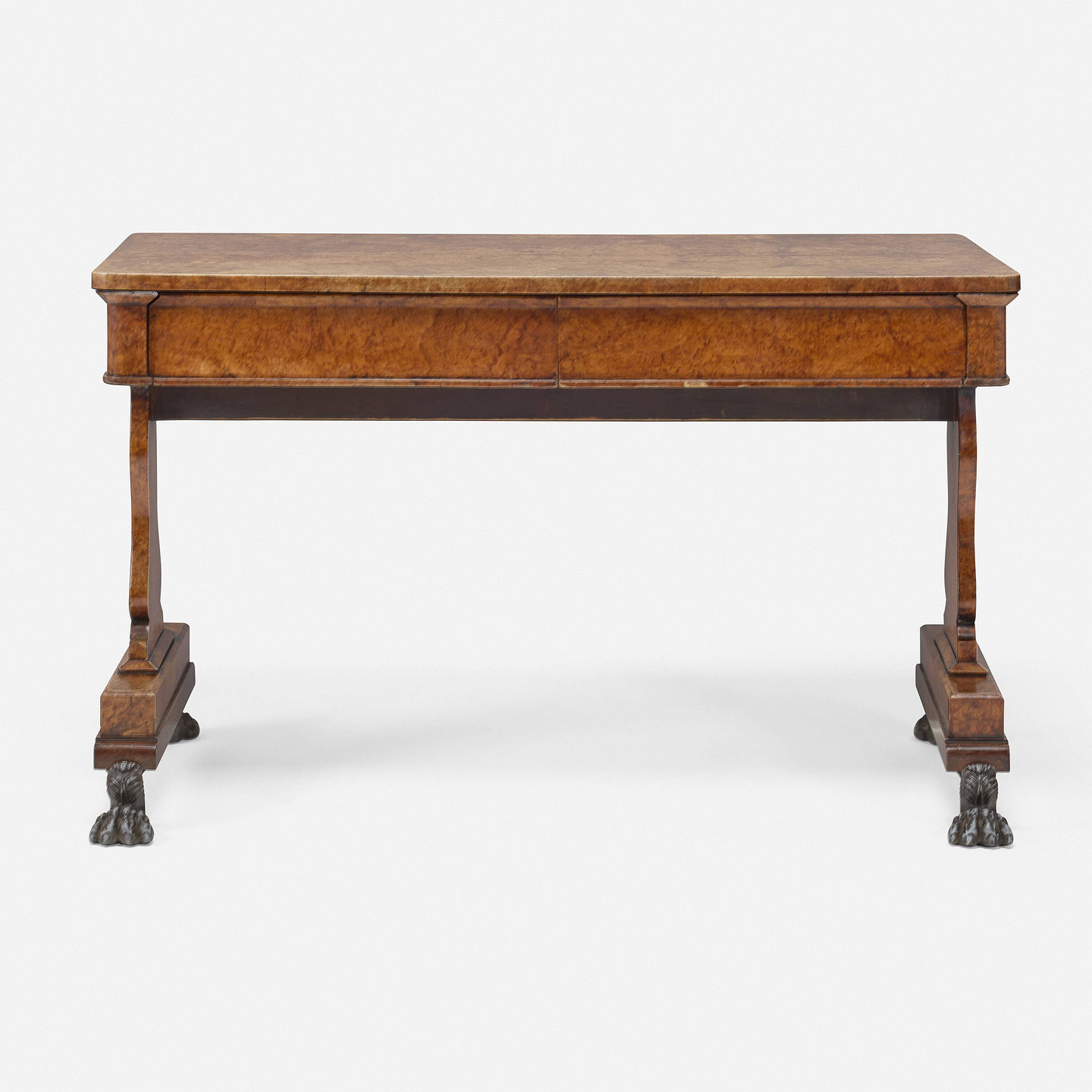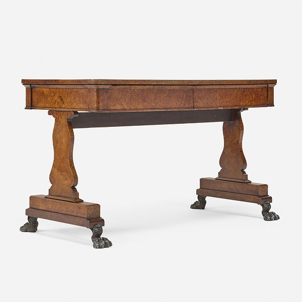 Regency period burled amboyna writing table, inset with two drawers and resting on patinated metal paw feet.England circa: 1830