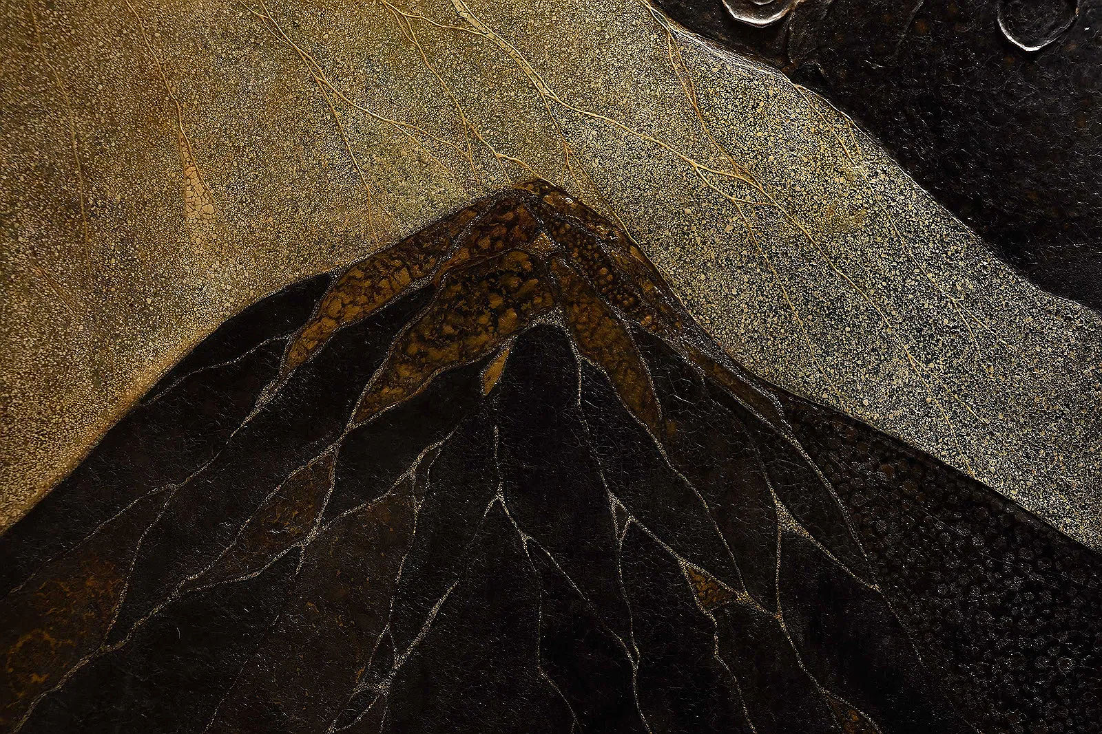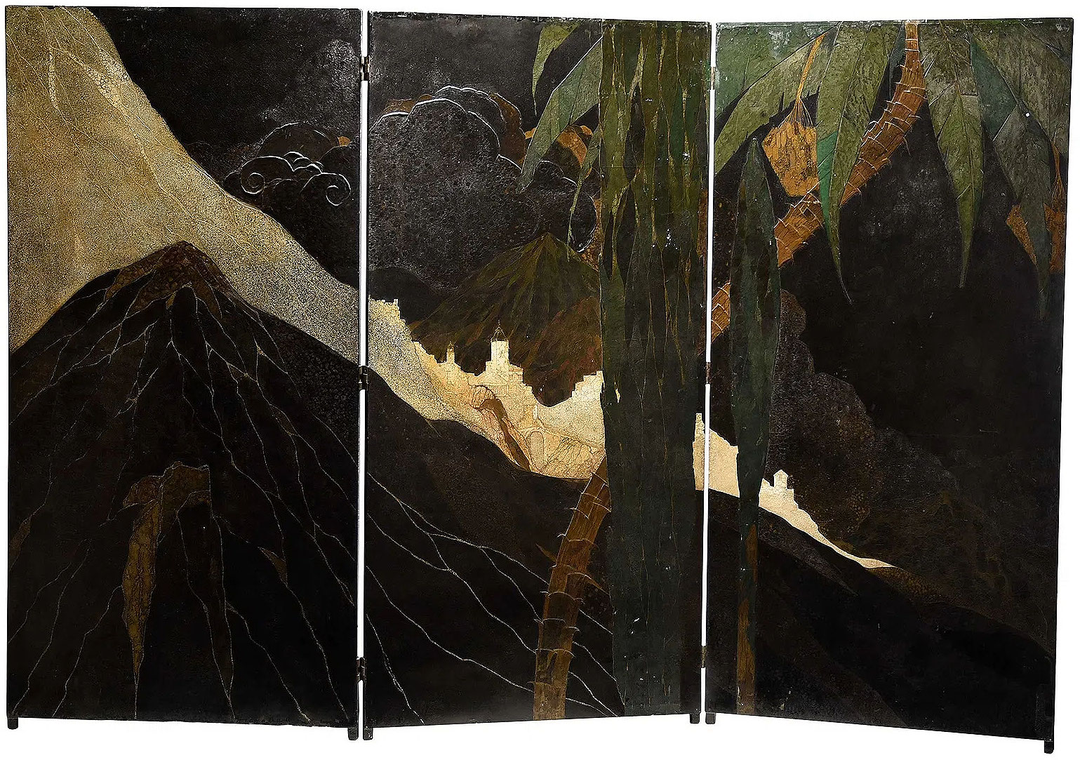 Spanish tropical mountain landscape on a three panel screen, polychrome lacquer, crushed egg shells (coquille d'oeuf), gold leaf/powder, gesso on plywood support, brass hinges, each panel 80-1/4 x 39-1/2 x 1-3/4 in. France:circa 1930, Provenance: The Sybarites Gallery, London, purchased 1970 (label verso Seabrite [sic] Gallery); Purchased by the Frank L. Babbott Fund for the Brooklyn Museum of Art collection; Property from the Brooklyn Museum Literature: Dr. J.C. Mardus, "Histoire de L'Adolescente de L'Ile de Cristal" in L'Illustration, Noel, 1933. The Noel 1933 issue of the magazine L'Illustration includes an article and illustrations of Gaston Priou's work, which substantiates the attribution of this screen to Priou. A copy of this issue is in the Brooklyn Museum's collection (75.48).