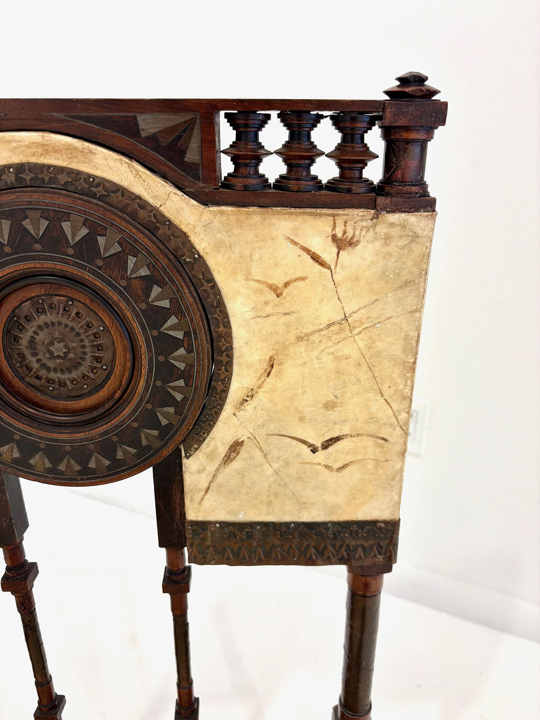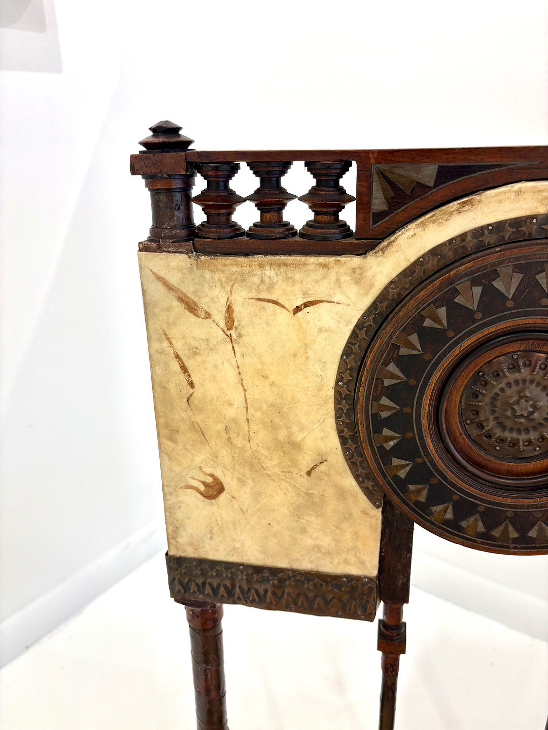 Rare carved walnut side chair by Carlo Bugatti upholstered with parchment and inlaid with pewter details and mounted with hammered copper decoration. Reffence: Beauty & Mischief: The Design Alchemy of Blackman Cruz, Blackman, Cruz and Stukin, pg. 132 illustrates similar example of Carlo Bugatti shown at Musée d'Orsay, Massé, Bugatti, Dejean, pg. 85 illustrates similar example. Italy: circa 1902 Provenance: Private collection Dallas Texas , Blackman Cruz collection Los Angeles