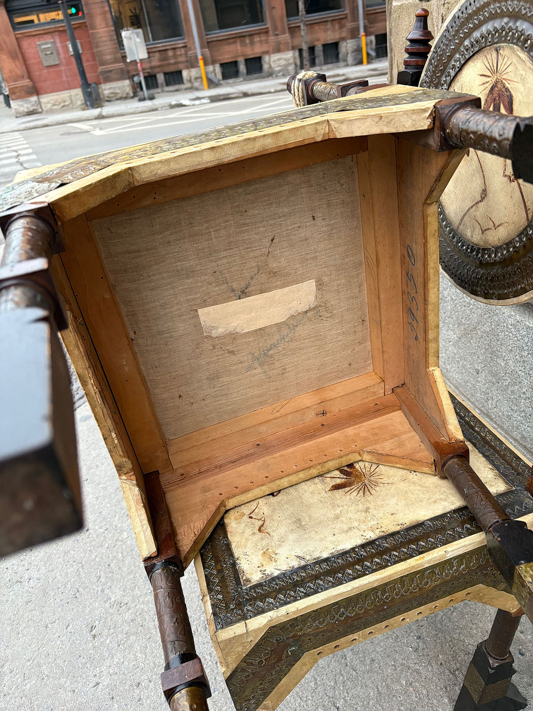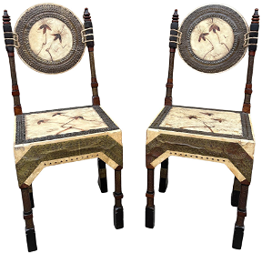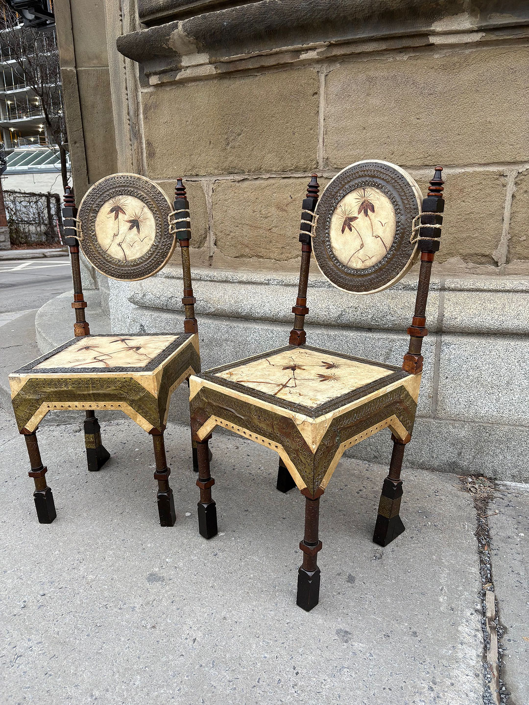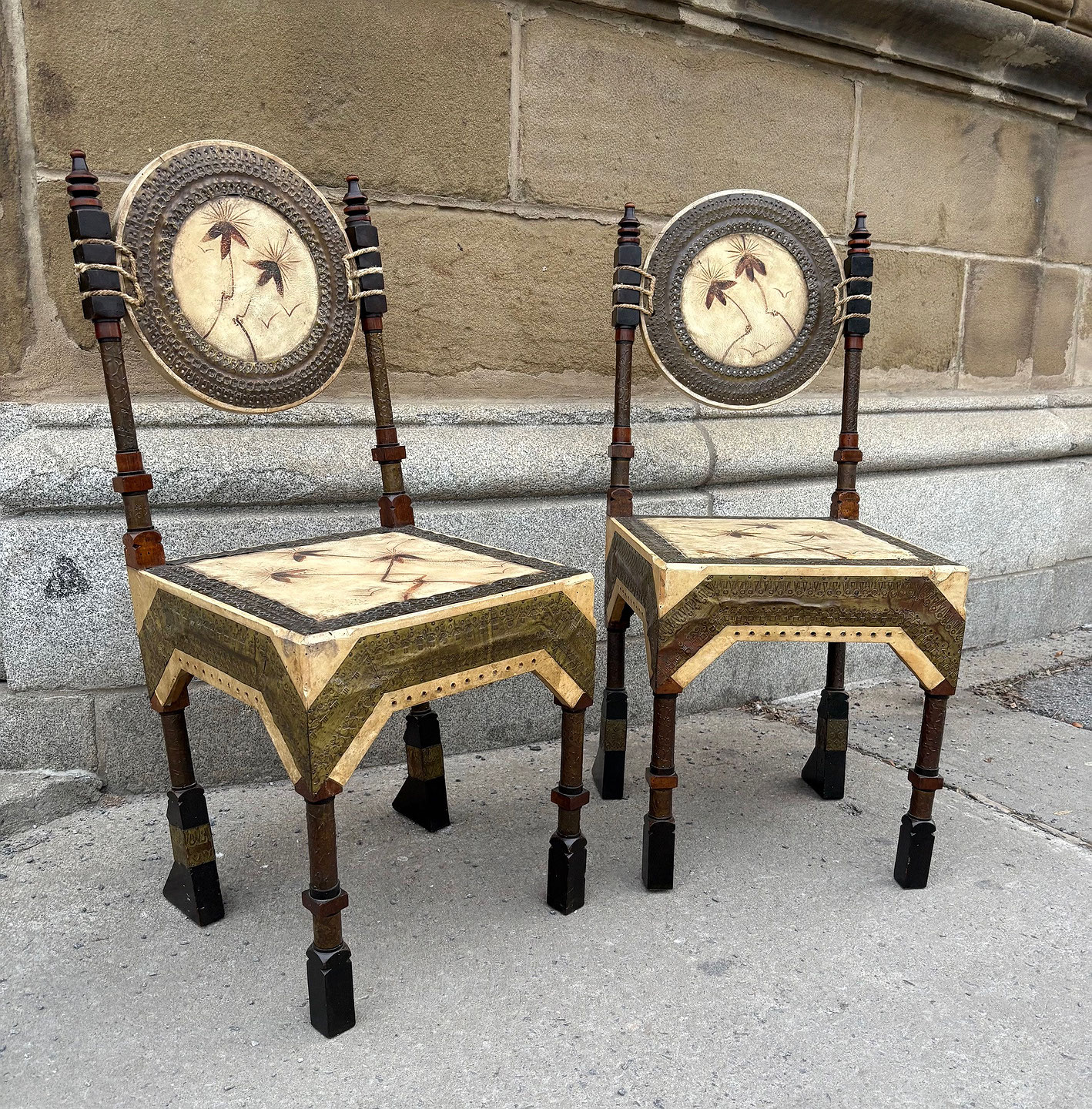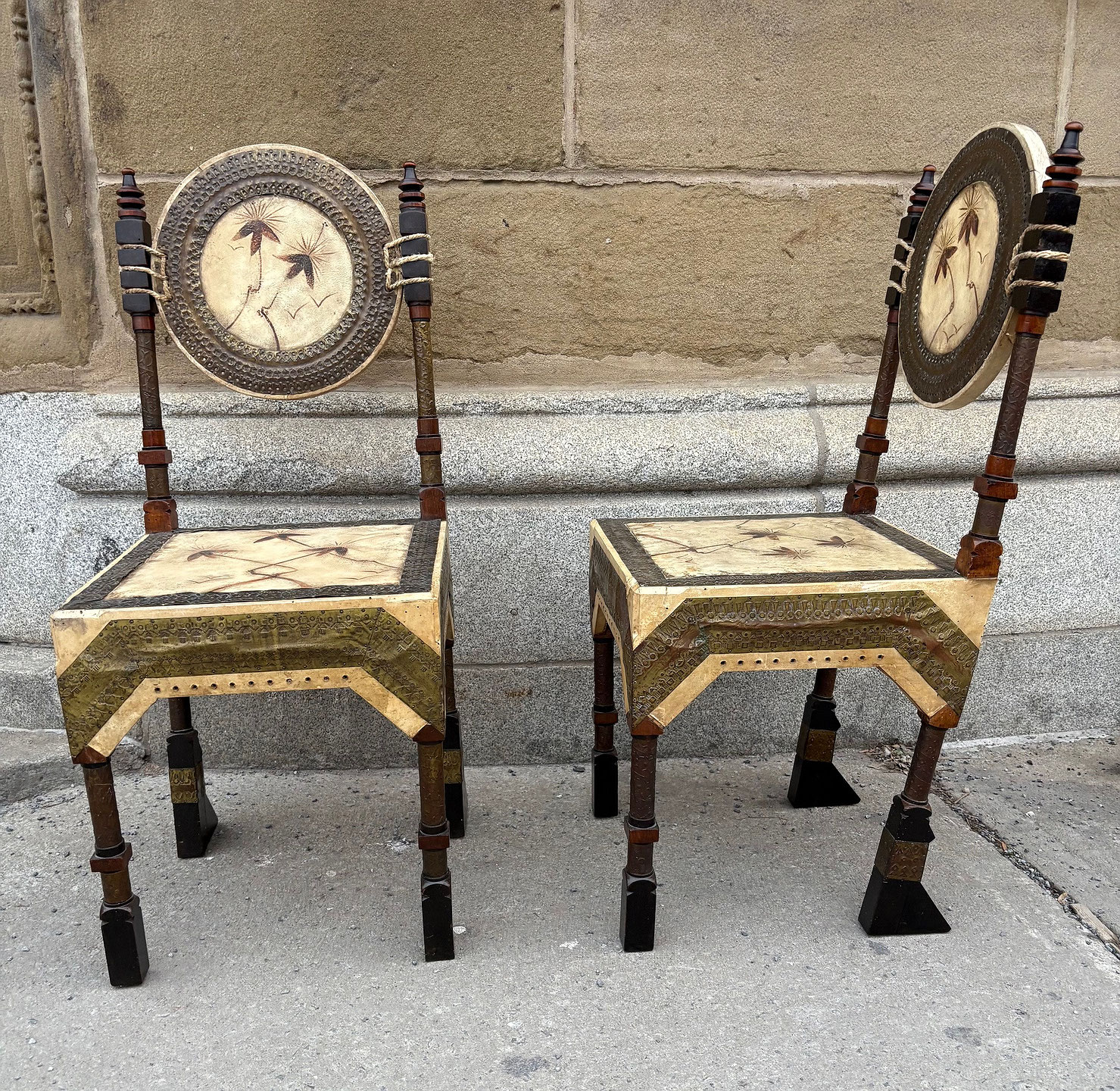 Rare pair of side chair by Carlo Bugatti made of ebonized wood, upholstered with parchment and inlaid with pewter details and mounted with hammered copper decorations. Italy: circa 1900. Carlo Bugatti was a famous designer active at the turn of the century. His pieces are rare and highly prized. He was the father of Rembrandt Bugatti who was a renowned sculptor, his work is also highly valuable and sought after . Ettore Bugatti, his other son founded the Bugatti Motor Car Company.