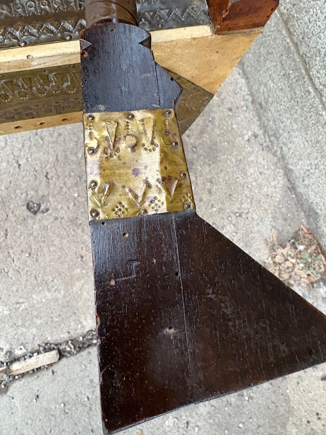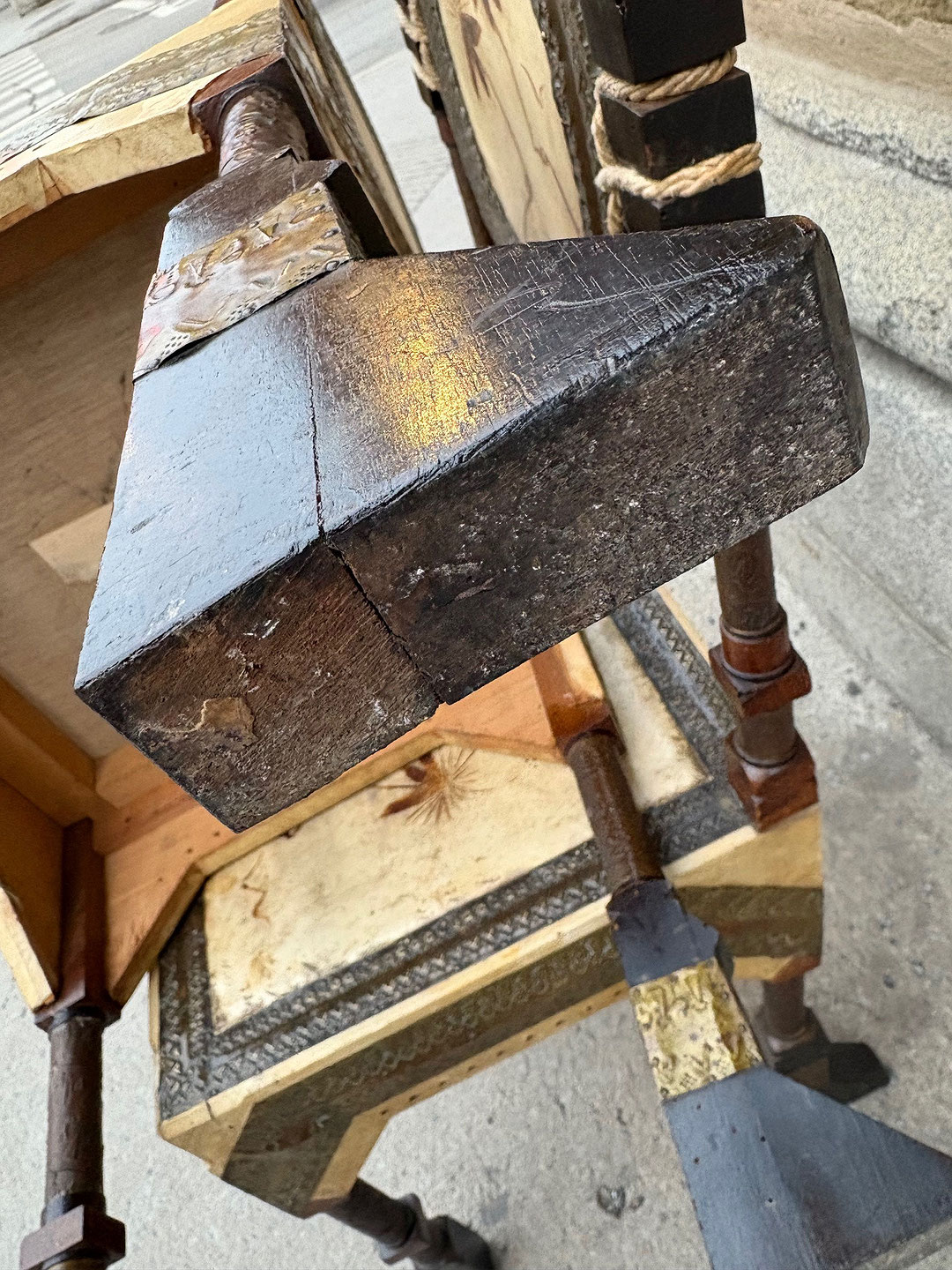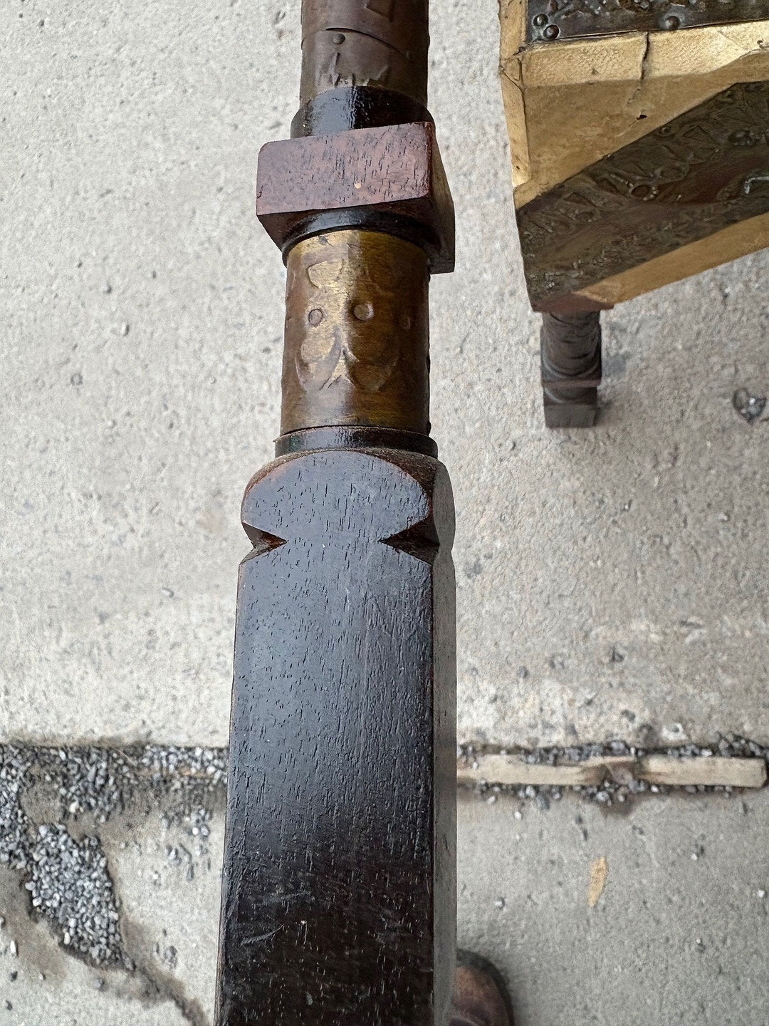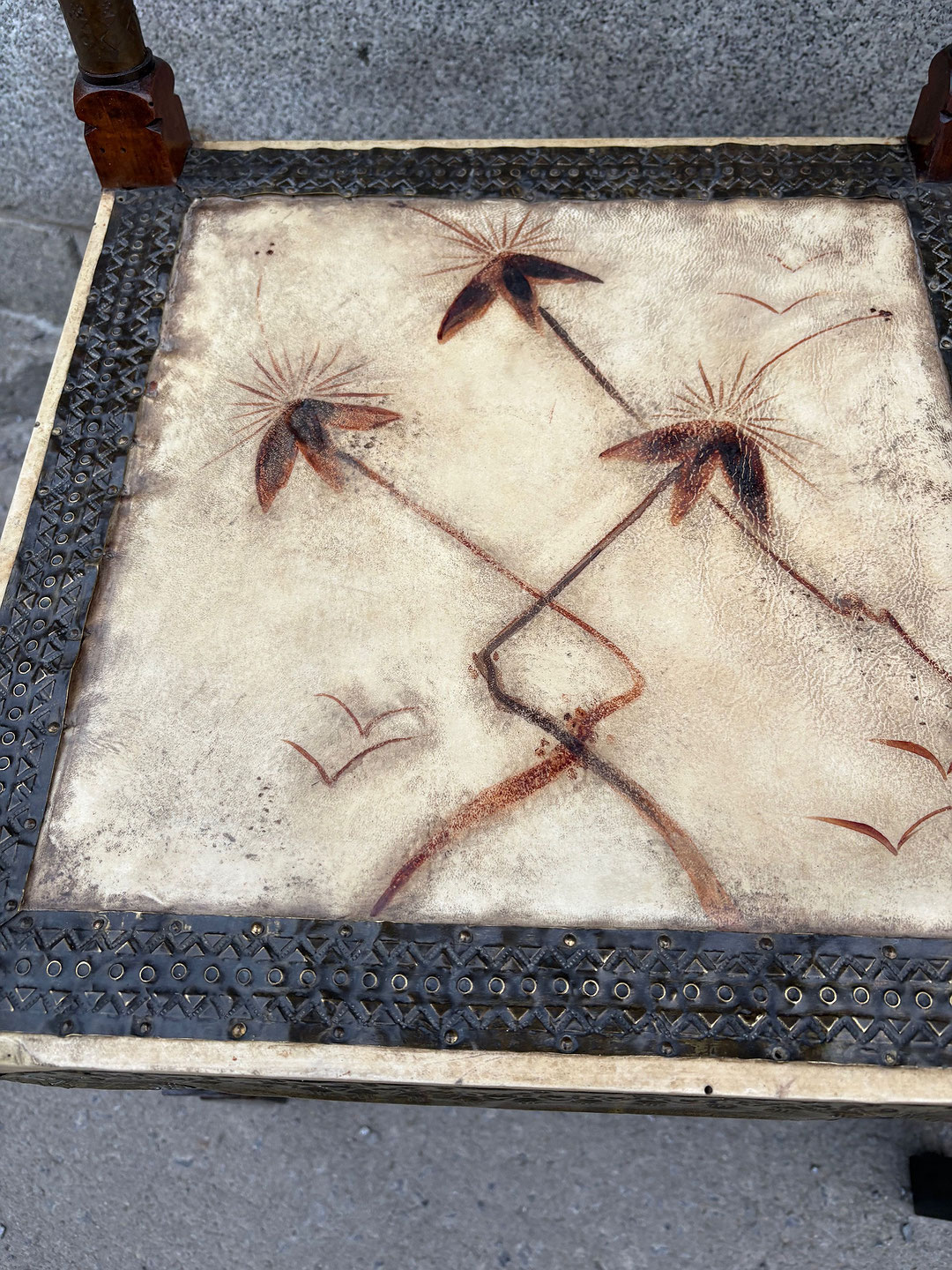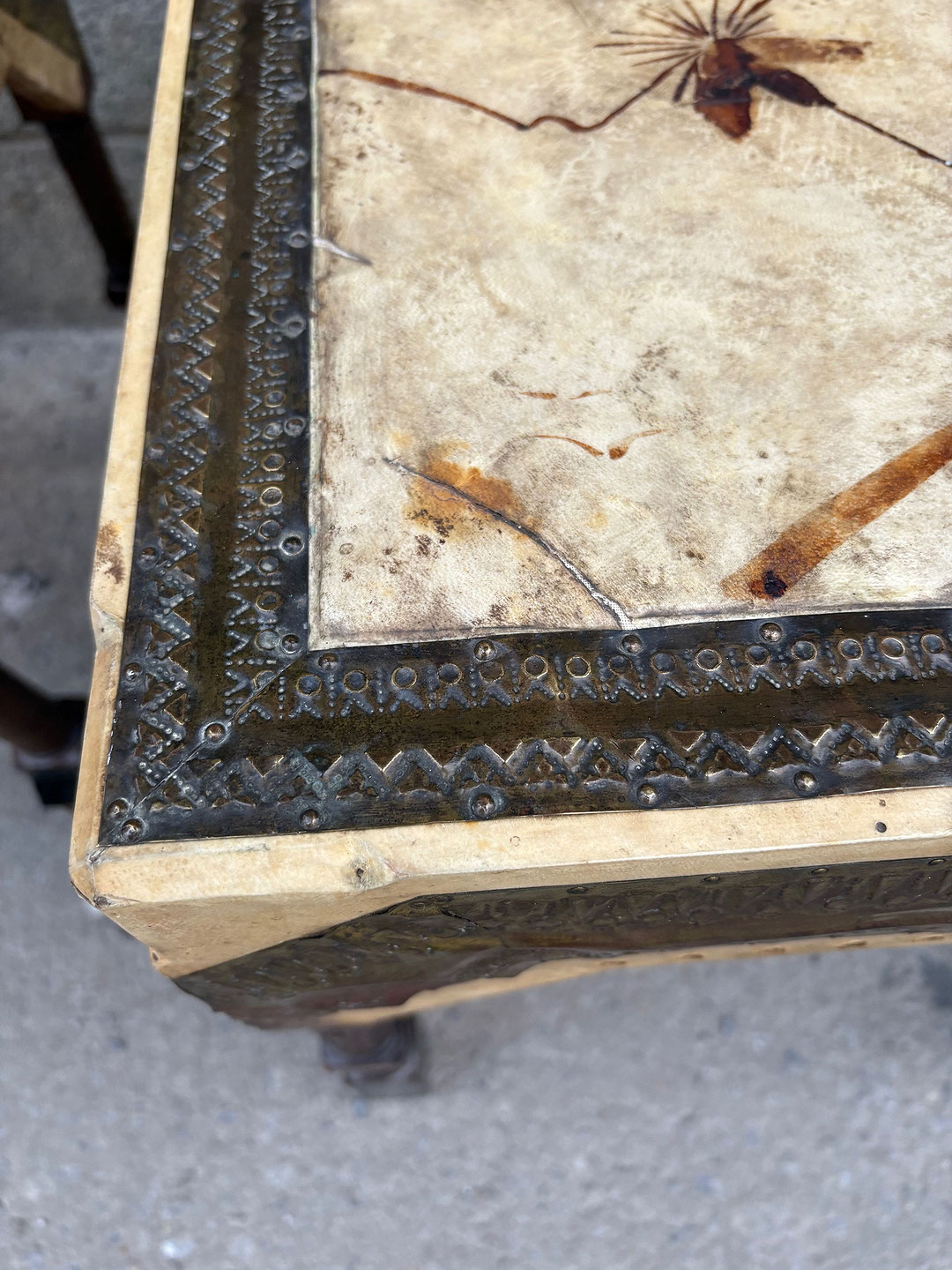 Rare pair of side chair by Carlo Bugatti made of ebonized wood, upholstered with parchment and inlaid with pewter details and mounted with hammered copper decorations. Italy: circa 1900. Carlo Bugatti was a famous designer active at the turn of the century. His pieces are rare and highly prized. He was the father of Rembrandt Bugatti who was a renowned sculptor, his work is also highly valuable and sought after . Ettore Bugatti, his other son founded the Bugatti Motor Car Company.