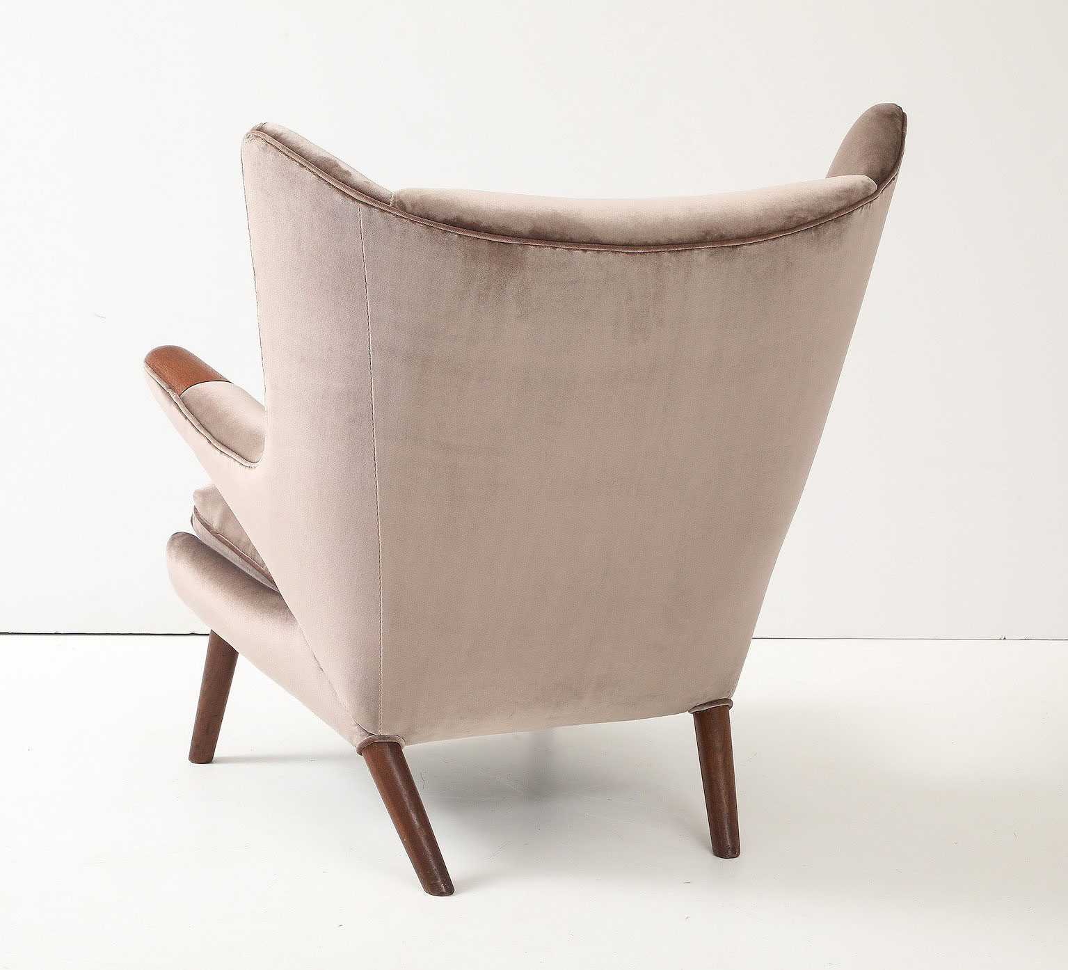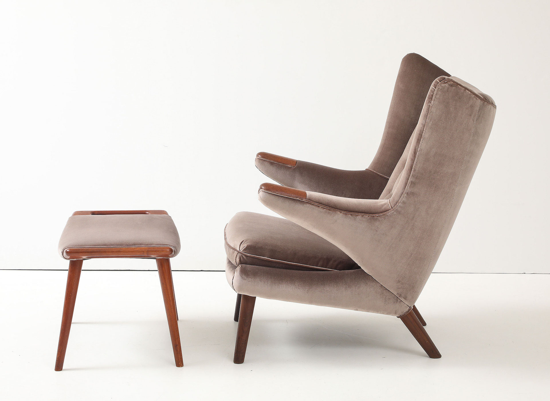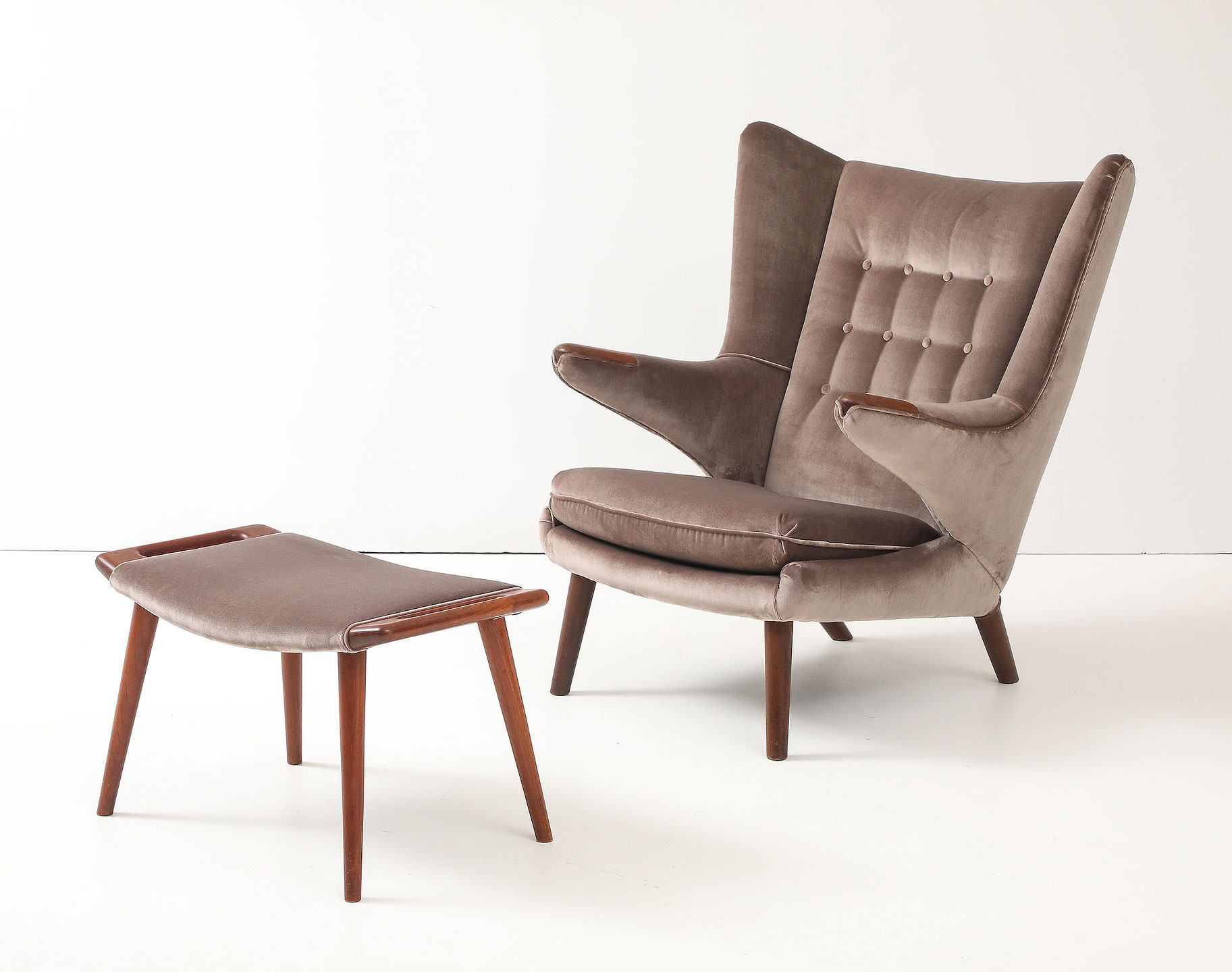 Teak ''Papa Bear'' Chair and Ottoman by Hans J. Wegner for A.P. Stolen, Signed with metal tag: "Furnituremakers Danish Control". Denmark: circa 1950 seat height: 16.5 Dimensions of the ottoman H:16 W:27.5 D:16 in. Provenance: Acquired in 1959 by the original owner | Private Collection, Duluth Minnesota . literature: Hans J. Wegner's 100 Chairs, Oda, pg. 49 Wegner: Sitting Pretty, Nielsen, pg. 70