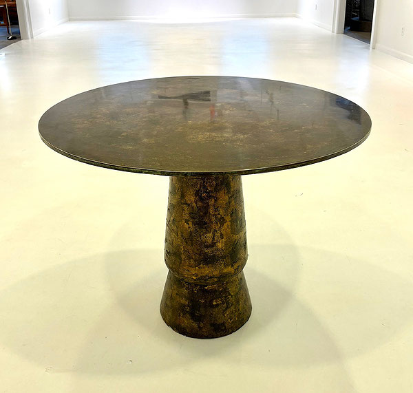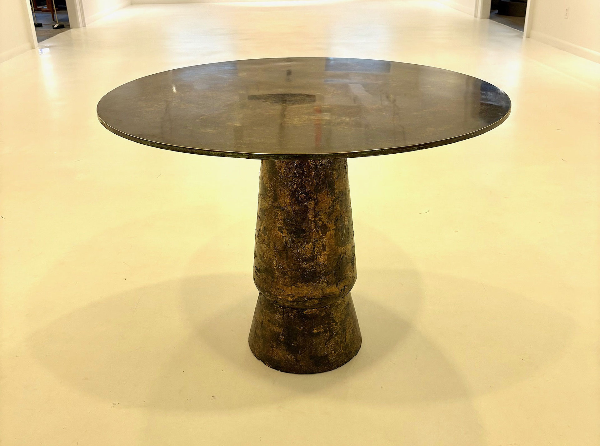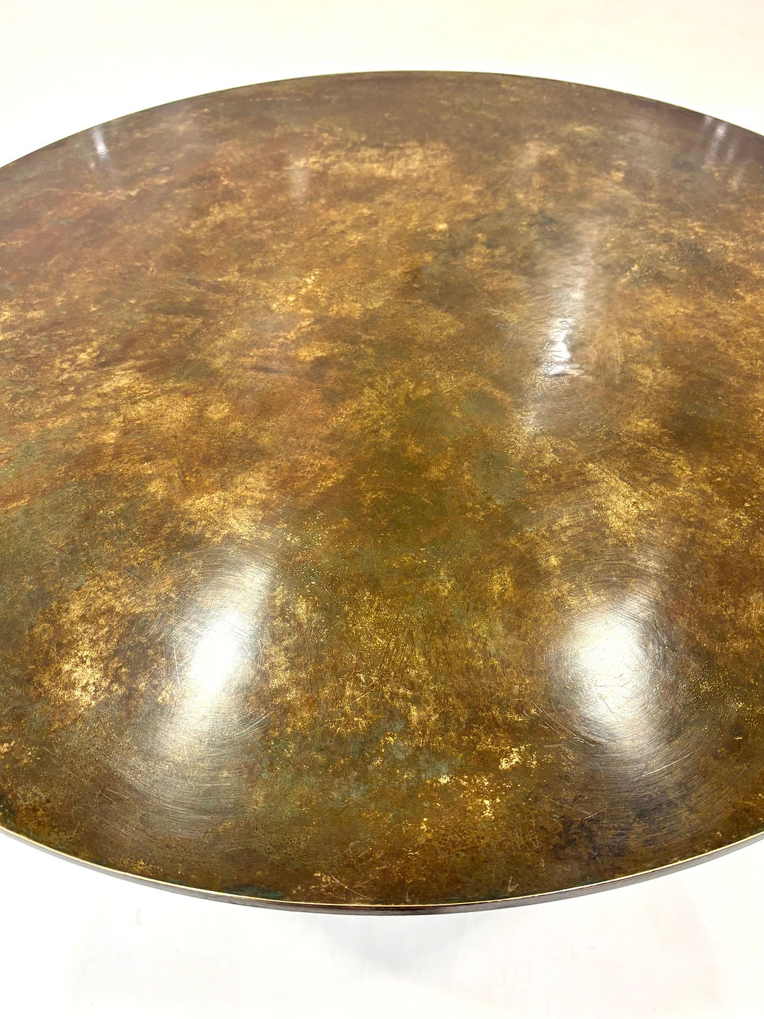 Patinated bronze center table, the solid bronze circular top resting on a wood sculpted resin column base. Studio made contemporary creation single edition S.W. Studios. USA 2025.
