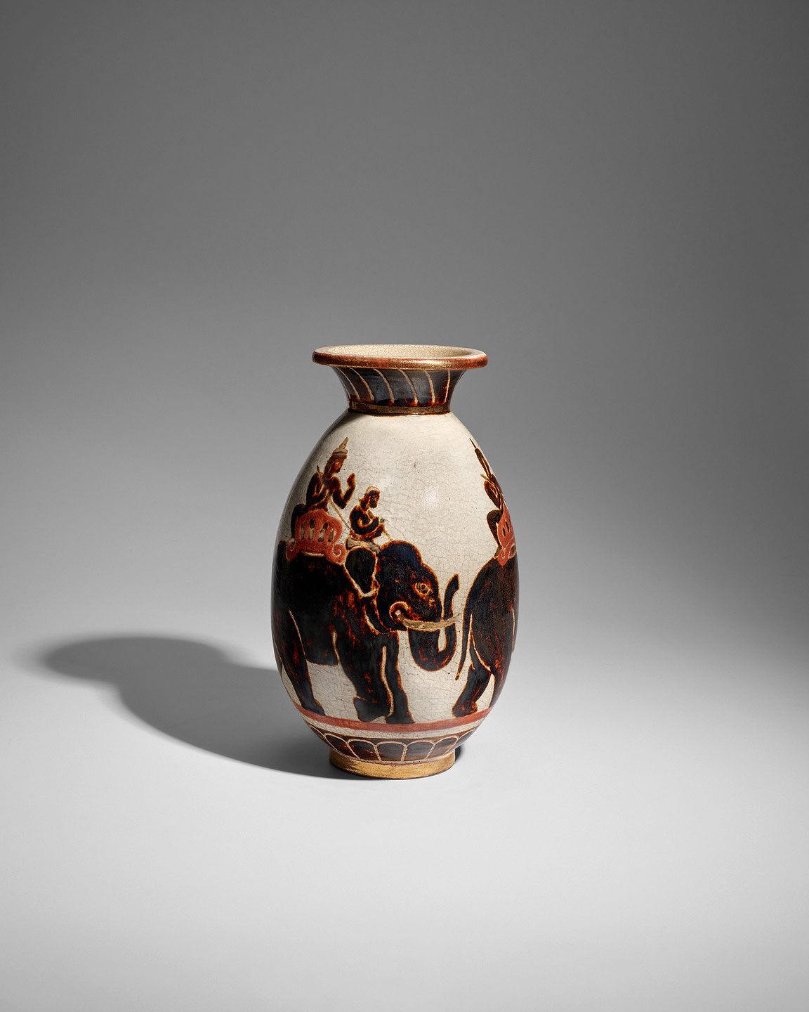 glazed & crackled ceramic Vase by Rene Buthaud depicting high dignitaries on elephants Glaze mark 'RB' France: circa 1925. Property from the Collection of Susan and Peter Hut Literature Pierre Cruege, 'Rene Buthaud 1886-1986', Les Editions de l'Amateur, 1996, p. 174 (model variant illustrated)