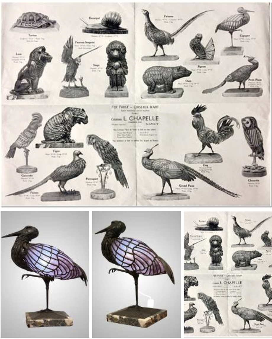 Rare art glass and wrought iron sculptural lamp by Muller-Frères, representing a peacock bird. This sculptural lamp is finely crafted with a brown patinated hammered iron sculpted bird by the Nics iron work manufacture og Lyon, inset with blown " Marmoreal" glass showing shades of blue and orange, set on a marble base. Etched signature on glass : "Muller Frères Luneville". Marked on iron base: "Nics Lyon" for l’atelier de ferronnerie Maroello Guaita, « France: circa 1925. Provenance: The Collection of Dr. Thomas Chua Muller Frères were French glass makers located in Lunéville, France. Their business ran from 1895 to 1933. They were renowned for producing art nouveau glassworks such as vases and lampshades.The Muller family originally came from Alsace. Some members of the family worked together with Émile Gallé before starting their own business. Muller Freres, French for Muller Brothers, made cameo and other glass from about 1895 to 1933. Their factory was first located in Luneville, then in nearby Croismare, France. After World War I, the company also made iron and glass chandeliers, vases and other decorative items. Pieces were usually marked with the company name.