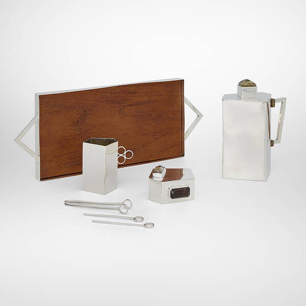 Service is comprised of teapot, creamer, sugar bowl, sugar cube tongs, and two stirrers. Illegible signature to underside of tray. USA: circa 1950 teapot: 6¼ h × 5 w × 3¼ d in tray: ¾ h × 13¾ w × 5⅛ d in