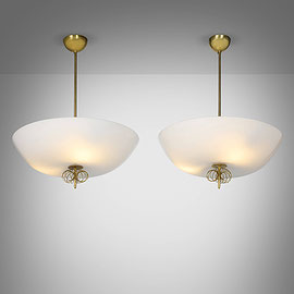 Pair of Brass and Opal Glass Hanging Lights by Paavo Tynell model 1088 Impressed manufacturer's mark to interior mount on each example ‘Idman’. Finland: 1954 provenance: Private Collection literature: Idman, manufacturer's catalog no. 136, pg. 29