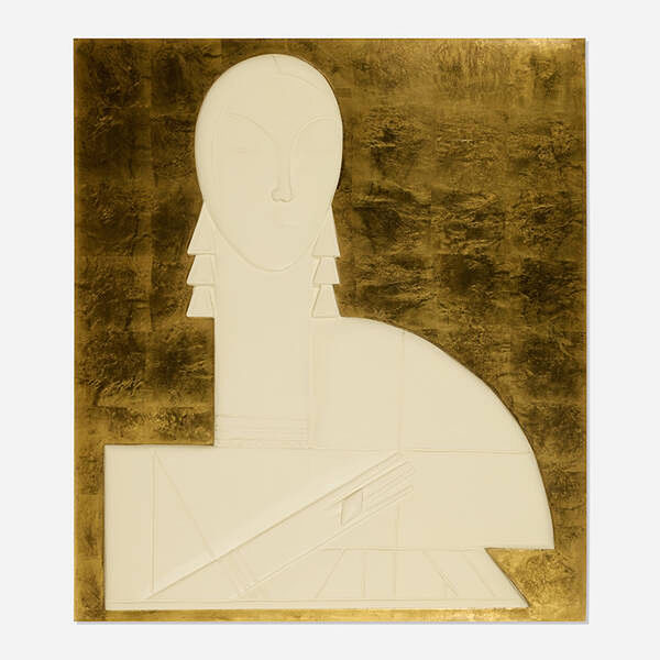 Art Deco female plaster relief on gold leaf background. France: circa 1940