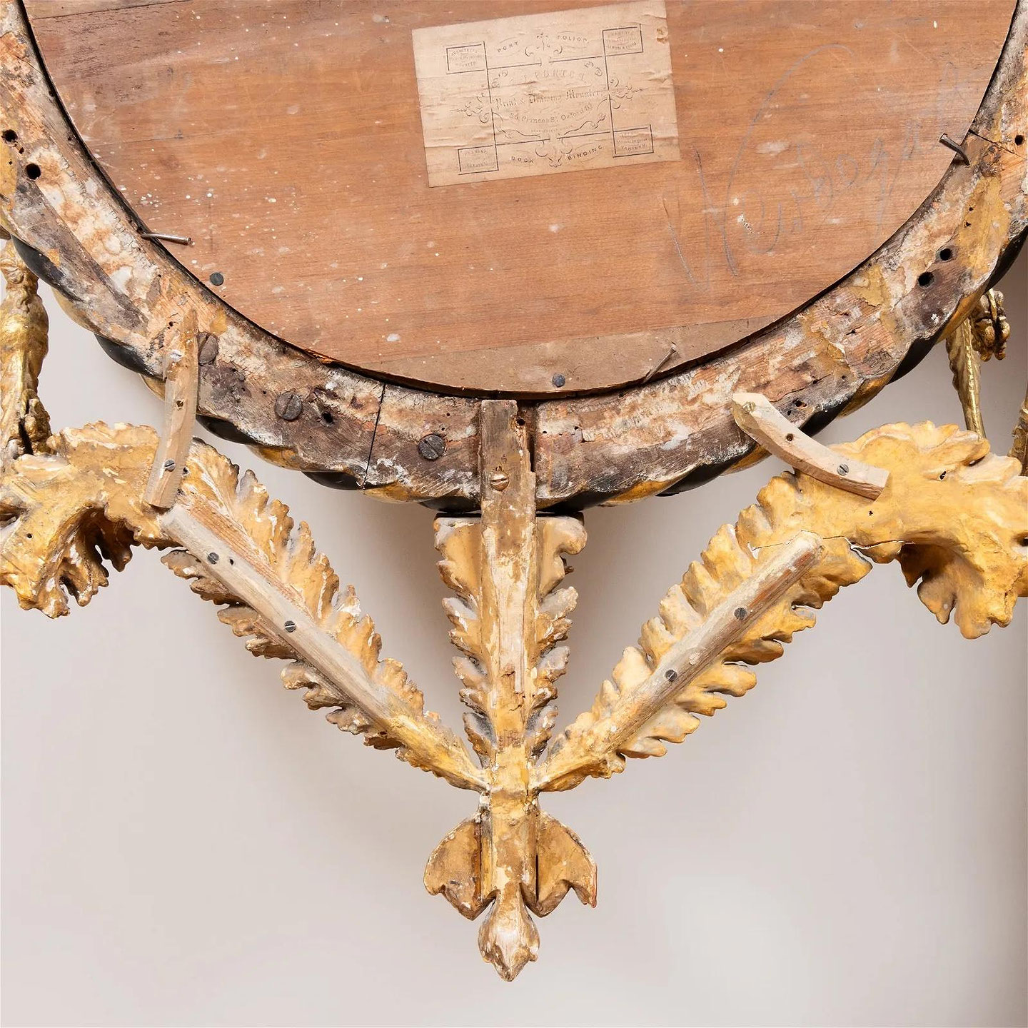 Miroir girandole à deux lumières en bois noirci et doré en partie de style Régence. Portant une étiquette collée du monteur d'estampes et de dessins près de Regent Circus Londres 26 Princes St Royaume-Uni.