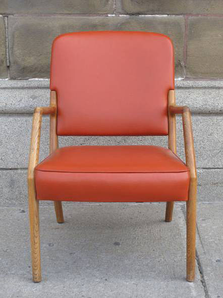 Paire de fauteuils en frêne, recouverts de cuirette orange. Etats-Unis, circa 1950