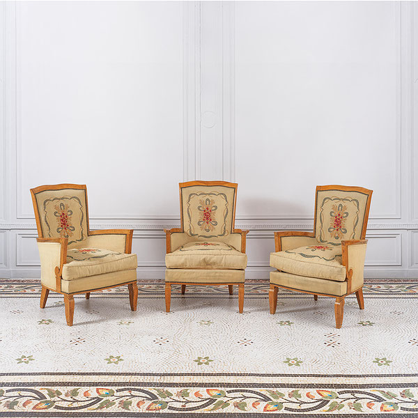 Suite de trois fauteuils en noyer et tapisserie d'Aubusson Estampillée 'J Leleu', '17991', '17992' et '17993' France: 1943 Provenance Collection Monsieur et Madame Arthur Lardillat, France Puis par succession jusqu'à l'actuel propriétaire Bibliographie J. Leleu, "Où en est l'Art Décoratif Français" in Mobilier et Décoration, n. 3, mars 1948, p. 74 pour nos exemplaires