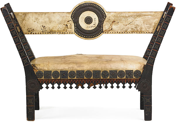 Ebonised walnut settee by Carlo Bugatti (1856-1940) decorated with pewter and brass inlay and embossed copper, upholstered with parchment.Carlo Bugatti was a famous designer active at the turn of the century. His pieces are rare and highly prized. He was the father of Rembrandt Bugatti who was a renowned sculptor, his work is also highly valuable and very rare since he died at 32. Ettore Bugatti, his other son founded the Bugatti Motor Car Company. .