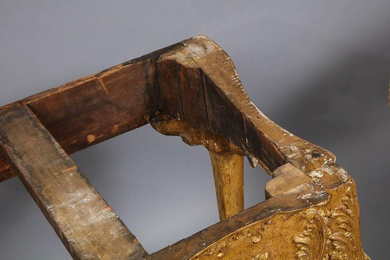 Fine 18th century Irish console table, the shaped Siena top with ogee edge over serpentine shaped frame having foliate and rocaille carving, the cabriole legs ending in leaf carved richly scrolled legs, retaining much original gilding, the top 18th century and probably original.