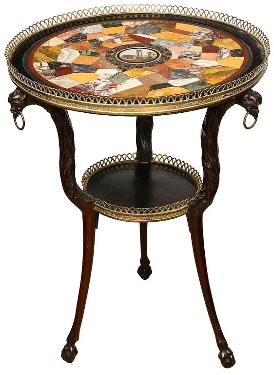 Very Fine Austrian Neoclassical gueridon table with gilt brass pierced gallery, the specimen marble top with Roman micro-mosaic center depicting ruins, having porphyry and malachite border, the body comprising random shaped specimen hardstones including Sienna Marble, Egyptian Alabaster, Porto and other marbles, over three eagle headed legs ending in claw and egg feet joined by galleried under-tier.