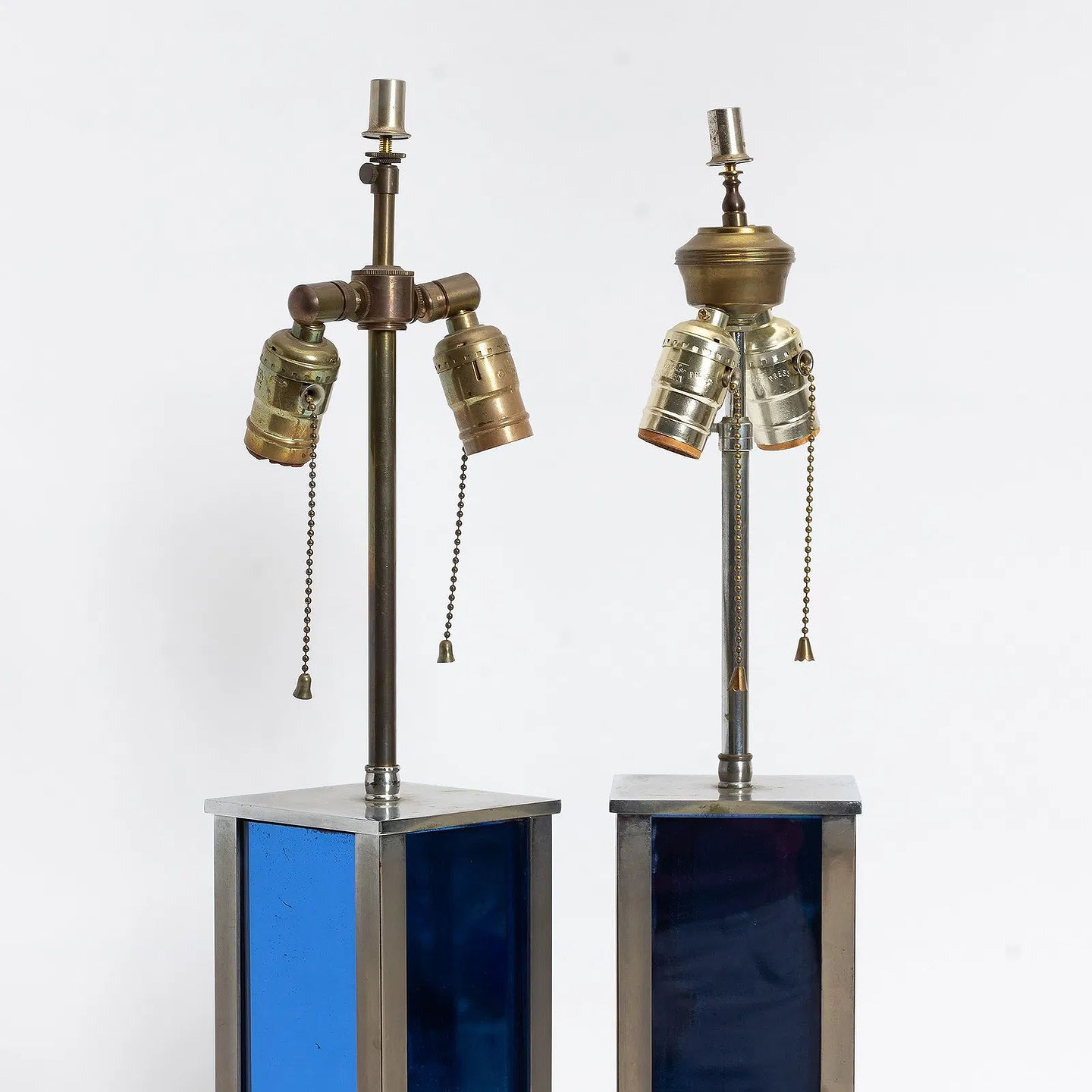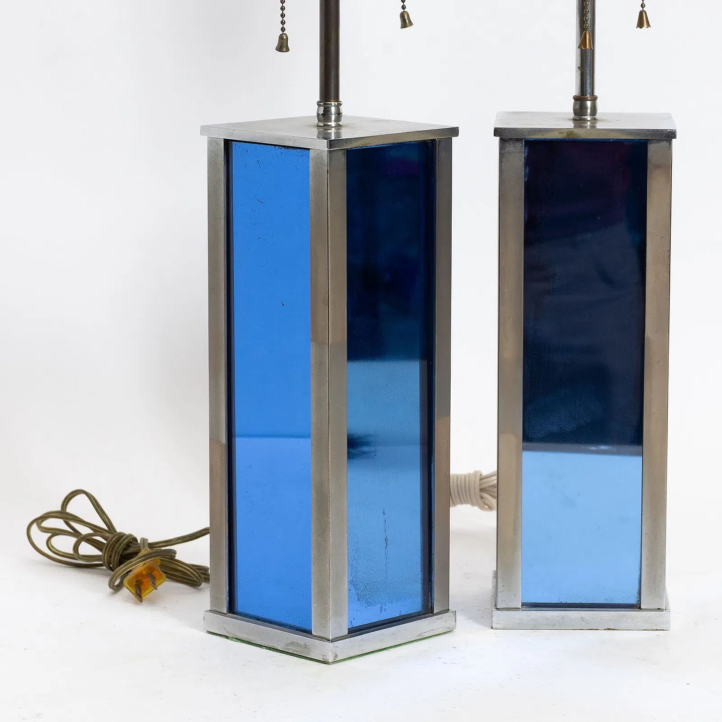 Pair of Chromed Metal and Blue Glass Lamps Italy: circa 1970