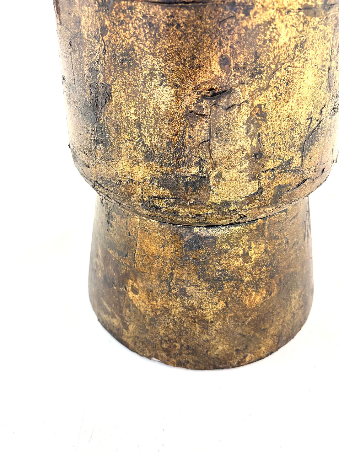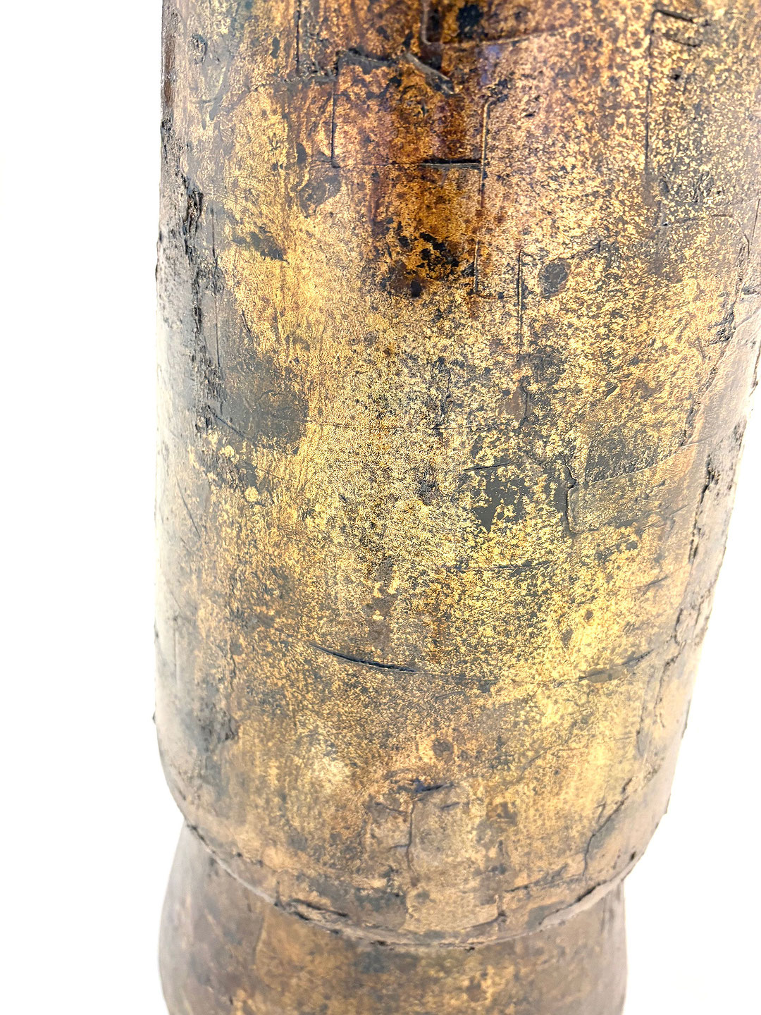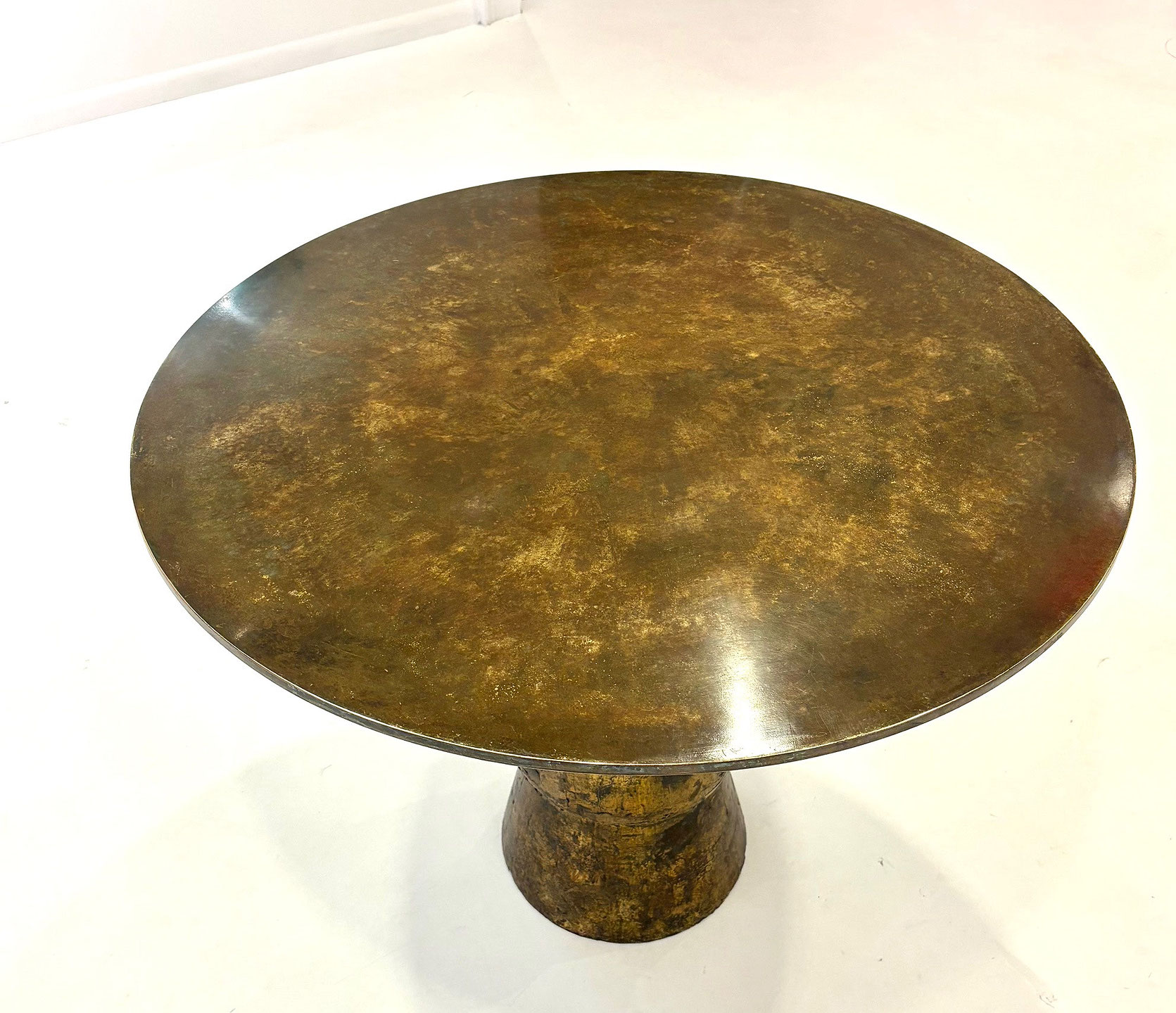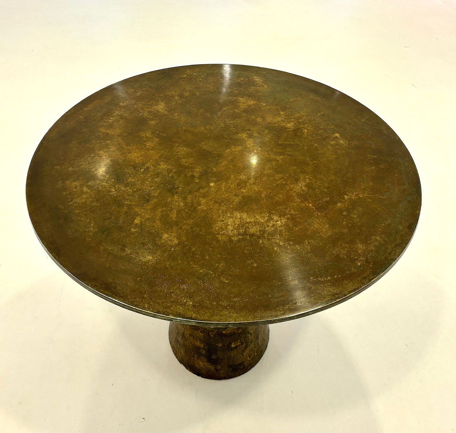 Patinated bronze center table, the solid bronze circular top resting on a wood sculpted resin column base. Studio made contemporary creation single edition S.W. Studios. USA 2025.