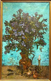 ADNET, Françoise (1924-2014) - Still life with flowers and candlestick. Françoise Adnet was the daughter of of the most influencial French furniture designer of the the 20th century , Jacques Adnet. She was an accomplished musician, as well as a painter and developed her own artistic style influenced by fellow Parisian artists like Bernard Buffet Jean Jansem and Francis Gruber. They were all reacting to the abstract artistic movement at the time, creating a new style known as post-war figurative art .Paris, France c.1960 . Signed upper right corner : Francoise Adnet .