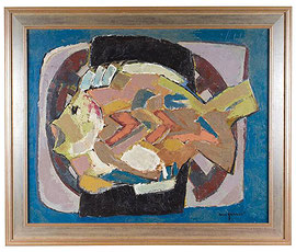 Raymond Guerrier , French (1920-2002). Abstract still life , "Dorade Bleue" , oil on canvas by French artist Raymond Guerrier . Signed : Guerrier at the bottom left. France: circa 1960. A self taught artist, he was very much influenced by George Braque, he won the "prix de la jeune peinture" in 1953 and his work is part of the collection of many museums (M.N.A.M of Paris, Musée Réatu in Arles, Musée Cantini of Marseilles, Museum of Tokyo, Museum of Saint-Louis etc…). Reference: p.79 Connaissance des Art Décembre 1962, Galerie Hervé Paris. Provenance: Private collection, Montreal.