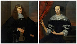 Interesting pair of 17th century Dutch portraits representing the likes of a nobleman and his wife. Both paintings bear the monogram AET along with an illegible second monogram , the age of the sitters is also indicated on each portraits , the lady is aged 32 and the gentleman is aged 35 . They are oil on canvas, unframed, set on their original stretchers , in very good condition showing small areas of old restorations visible upon close inspection .
