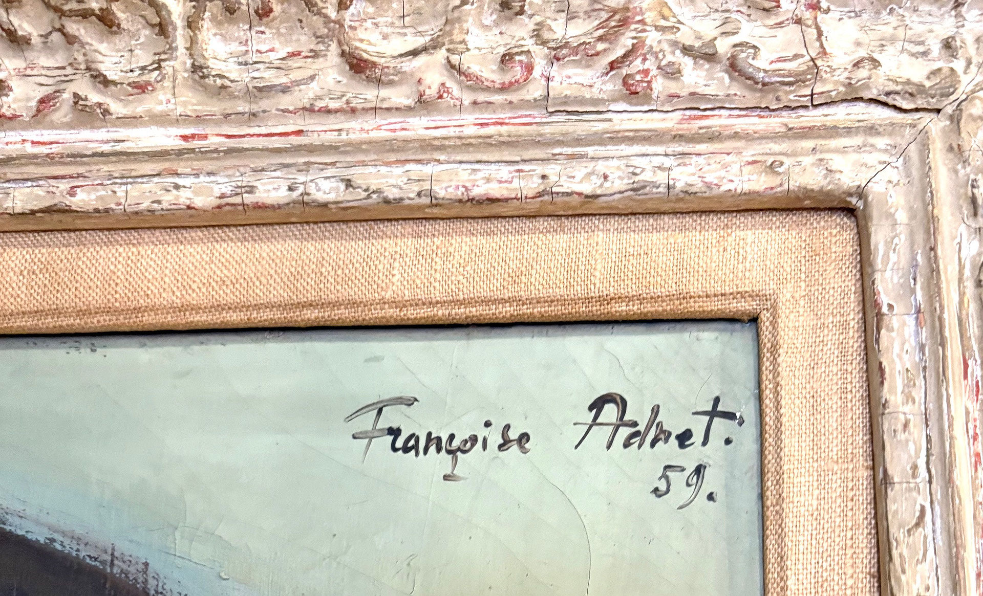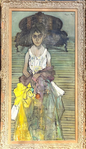 ADNET, Françoise (1924-2014) - Girl in a dress . Françoise Adnet was the daughter of of the most influencial French furniture designer of the the 20th century , Jacques Adnet. She was an accomplished musician, as well as a painter and developed her own artistic style influenced by fellow Parisian artists like Bernard Buffet Jean Jansem and Francis Gruber. They were all reacting to the abstract artistic movement at the time, creating a new style known as post-war figurative art .Paris, France c.1960 . Signed upper right corner : Francoise Adnet .