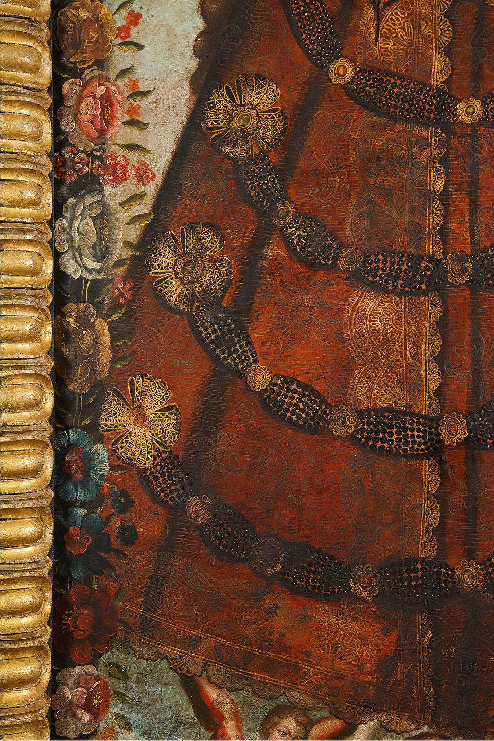 Exceptional 18th Century Cuzco school depiction of the Virgin Mary and Christ child, both wearing feathered headdresses and with angels surrounding her halo rays, he holding an orb, she holding the infant in one hand along with a rosary and crucifix and a lily in the other, her hair cascading over her floral engraved gown, the border decorated with various flowers, with more angels at their feet. Peru 18th Century