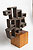 1970's abstract sculpture consisting of multiple odd geometric shapes resting on a wooden base. Canada: circa 1970