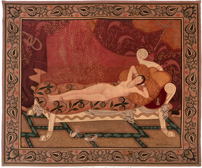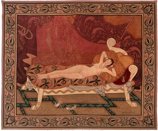 Wool Tapestry "Danae" by Edmund Dulac and woven by Léo Belmonte Signed to lower right corner in weave: Edmund Dulac, 1915 Inscribed to lower left corner in weave: TISSE PAR LEO BELMONTE PRO PAUL LEDERLIN. France: 1915 Provenance: Part of a private New York collection for the past 40 years LITERATURE: International Studio, vol. 62, New York, 1917, p. 159 (similar example illustrated).