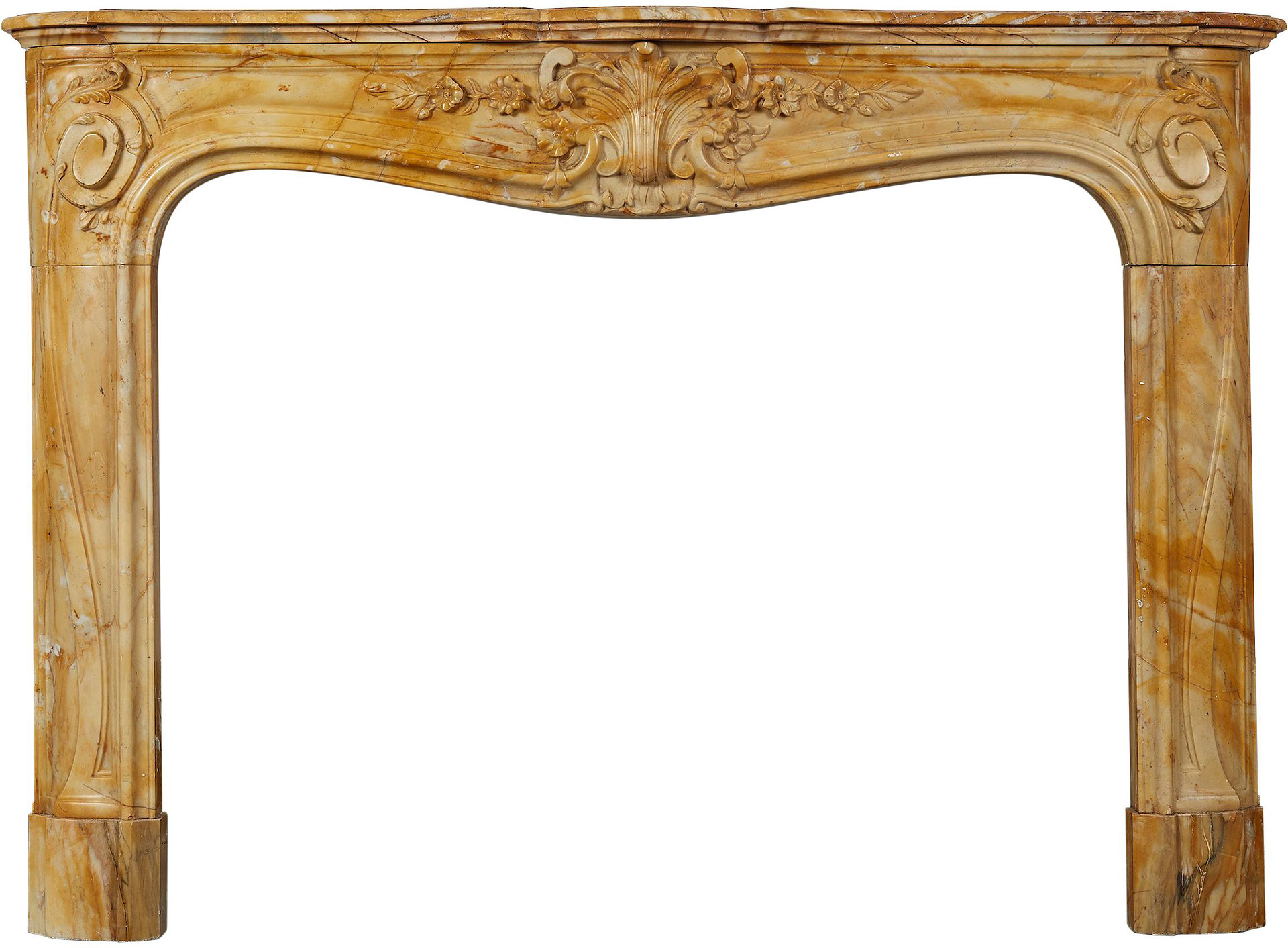 Regence style yellow sienna marble mantel (fireplace). Interior dimensions: H 35, W 45.25 in.
