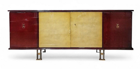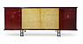 Maison LELEU GRAND BUFFET ENFILADE Circa 1960 en bois laqué et piètement en bronze. Il ouvre par 4 portes et décoré sur les extrémités de motifs naturalistes et géométriques Signé à l'intérieur dans un cartouche Complet de ses 3 clefs (deux tordues) 95 x 234 x 52 cm (petits accidents, manques et chocs à la laque, état d'usage) Bibliographie l Modèle similaire répertorié page 238 dans Leleu par F. Siriex, Edition M.Hayot 2007. Modèle proche reproduit page 147 de l'ouvrage Leleu 50 ans de mobilier de décoration Editions Somogy. Provenance l Succession d'un appartement dans la Californie à Cannes
