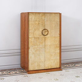 Very rare parchment covered cabinet by André Arbus, the front door decorated with the sickle and the sheaf of wheat in honor to agriculture. Signed and dated: André Arbus '36. Paris , France circa 1936 . Reference: André Arbus by Yvonne Brunhammer. Edition Norma, France: 1996. p.129-133-134 This cabinet was commissioned for the Ministre de L’Agriculture of France Georges Monnet in 1936 by fellow ministers Léon Blum ,Vincent Auriol and others at the occasion of the birth of his child. The ministers all signed their names on the door of the cabinet.