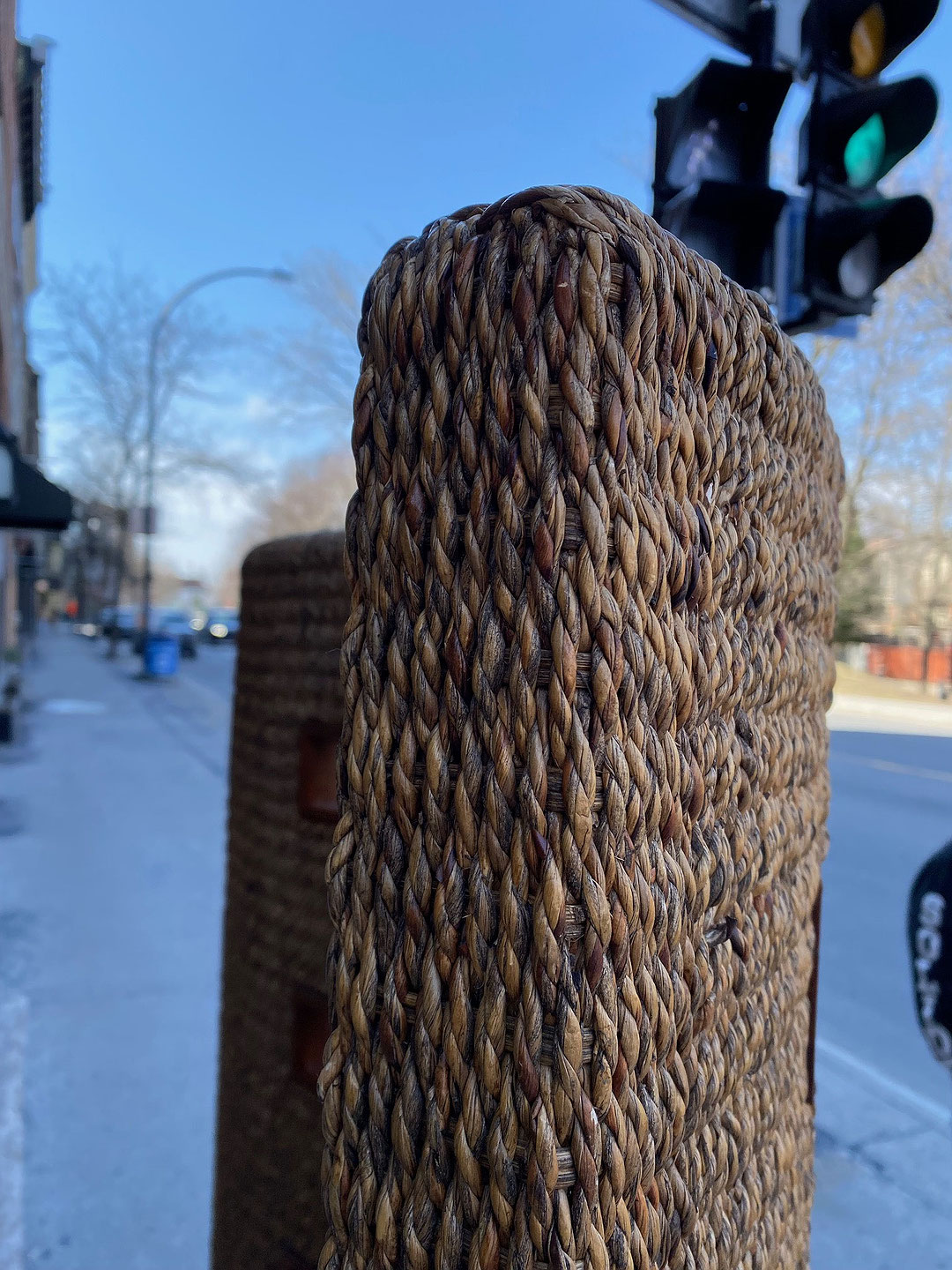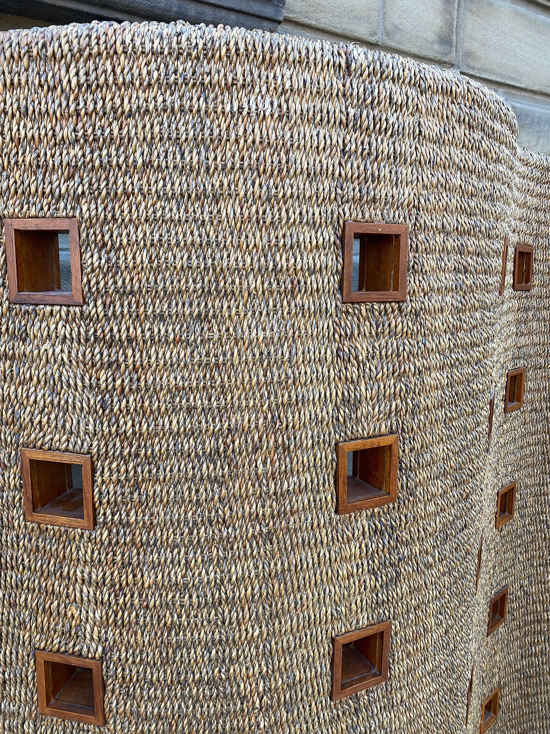 Great sea grass and teak free standing sinuous from screen /room divider decorated with 49 small teak windows. France , circa 1970