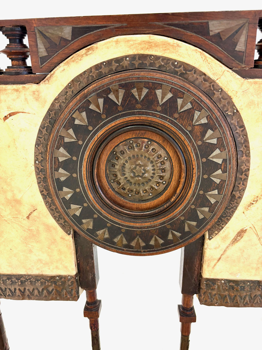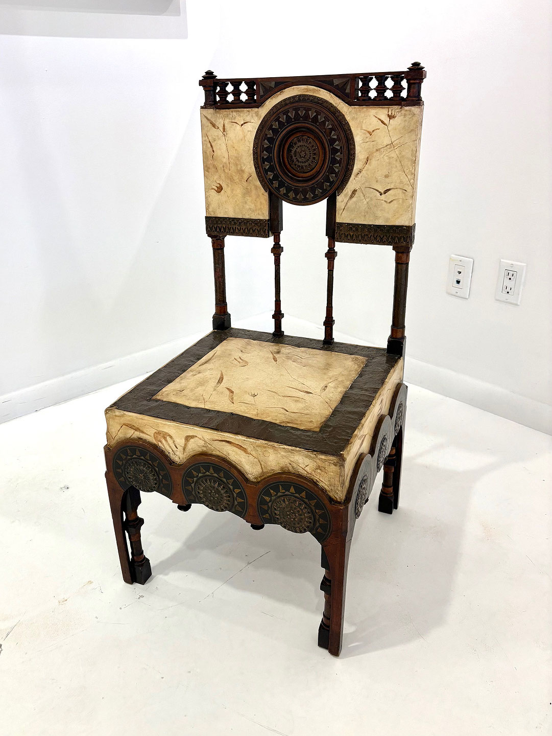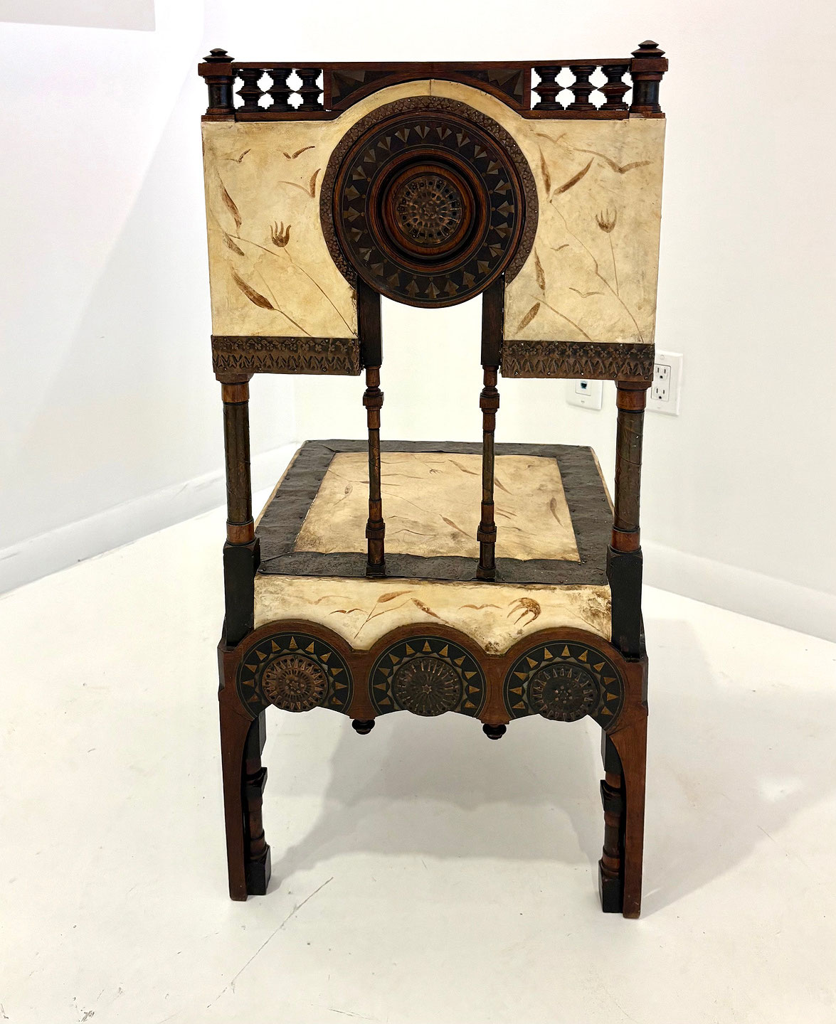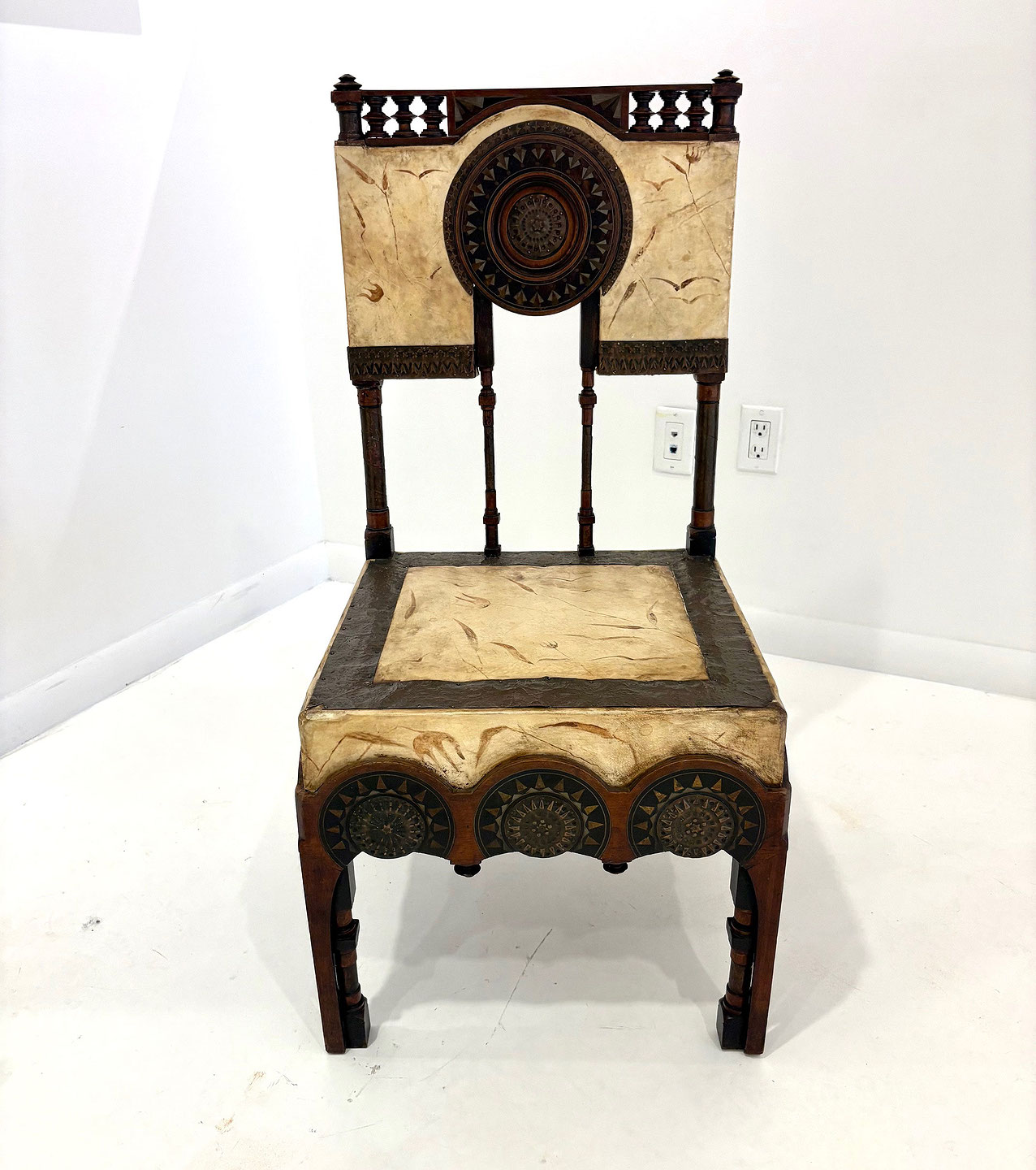 Rare carved walnut side chair by Carlo Bugatti upholstered with parchment and inlaid with pewter details and mounted with hammered copper decoration. Reffence: Beauty & Mischief: The Design Alchemy of Blackman Cruz, Blackman, Cruz and Stukin, pg. 132 illustrates similar example of Carlo Bugatti shown at Musée d'Orsay, Massé, Bugatti, Dejean, pg. 85 illustrates similar example. Italy: circa 1902 Provenance: Private collection Dallas Texas , Blackman Cruz collection Los Angeles