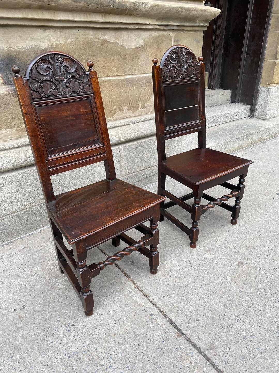 Pair of English 17th century period oak hall chairs. England: circa 1680