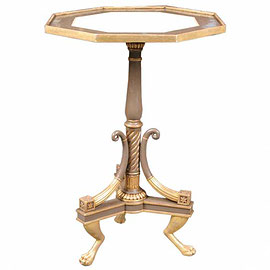 Regency period painted and parcel gilt octagonal table on tripod base featuring lion paw form. Based on a design by George and Richard Gillow of Oxford St. A similar example was known to have been made by Gillow in 1803 for Stephen Tempest of Broughton Hall, North Yorkshire (Reference: Gillow of Lancaster and London, by Susan E. Stuart, p 120 plate 670). England circa 1820.