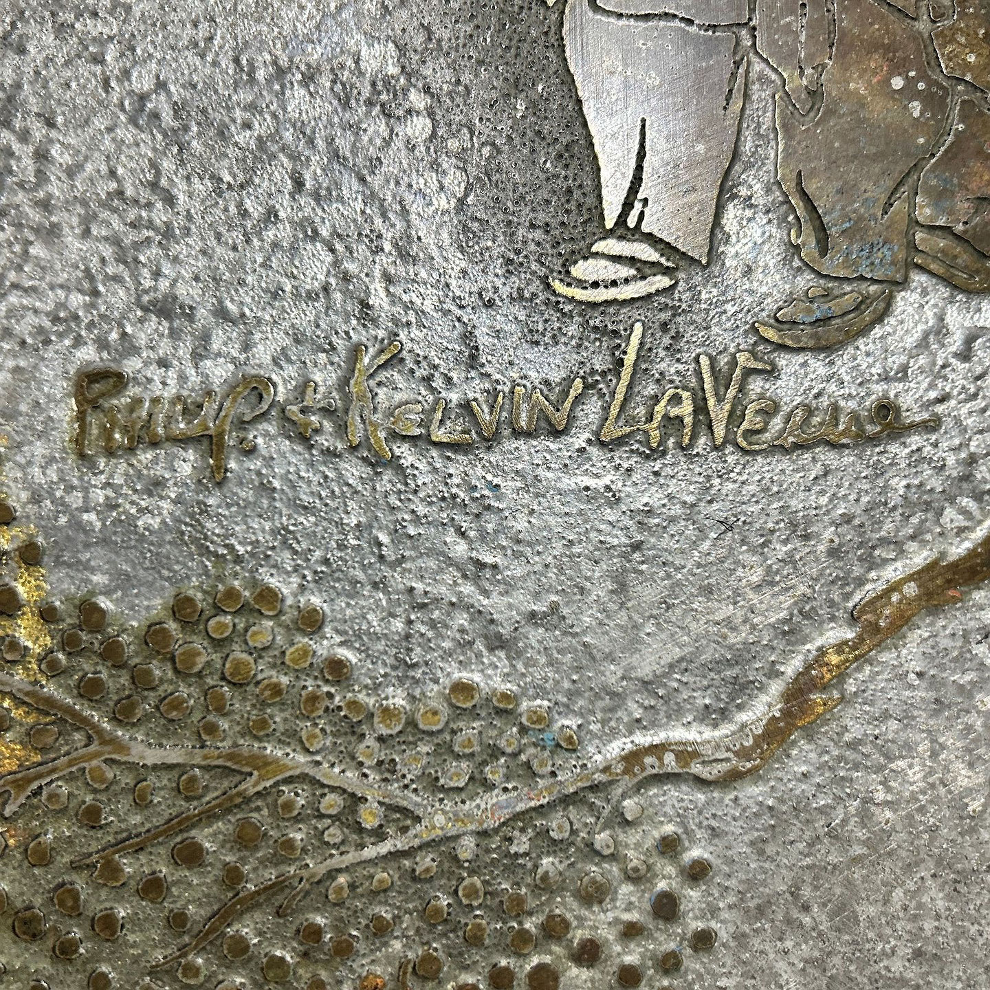 Engraved and acid-etched, patinated and polychromed bronze, pewter and enamel "Chan" circular coffee table by Philip and Kelvin LaVerne. Signed "Phillip and Kelvin Laverne." USA circa: 1965
